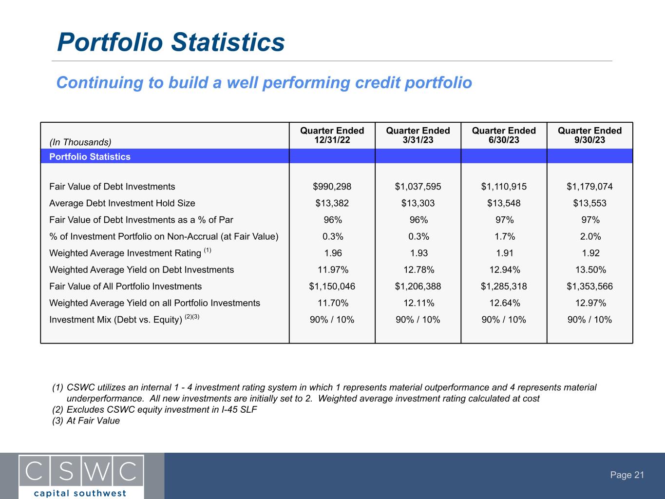 Page 21 Portfolio Statistics (1) CSWC utilizes an internal 1 - 4 investment rating system in which 1 represents material outperformance and 4 represents material underperformance. All new investments are initially set to 2. Weighted average investment rating calculated at cost (2) Excludes CSWC equity investment in I-45 SLF (3) At Fair Value Continuing to build a well performing credit portfolio (In Thousands) Quarter Ended 12/31/22 Quarter Ended 3/31/23 Quarter Ended 6/30/23 Quarter Ended 9/30/23 Portfolio Statistics Fair Value of Debt Investments $990,298 $1,037,595 $1,110,915 $1,179,074 Average Debt Investment Hold Size $13,382 $13,303 $13,548 $13,553 Fair Value of Debt Investments as a % of Par 96% 96% 97% 97% % of Investment Portfolio on Non-Accrual (at Fair Value) 0.3% 0.3% 1.7% 2.0% Weighted Average Investment Rating (1) 1.96 1.93 1.91 1.92 Weighted Average Yield on Debt Investments 11.97% 12.78% 12.94% 13.50% Fair Value of All Portfolio Investments $1,150,046 $1,206,388 $1,285,318 $1,353,566 Weighted Average Yield on all Portfolio Investments 11.70% 12.11% 12.64% 12.97% Investment Mix (Debt vs. Equity) (2)(3) 90% / 10% 90% / 10% 90% / 10% 90% / 10%