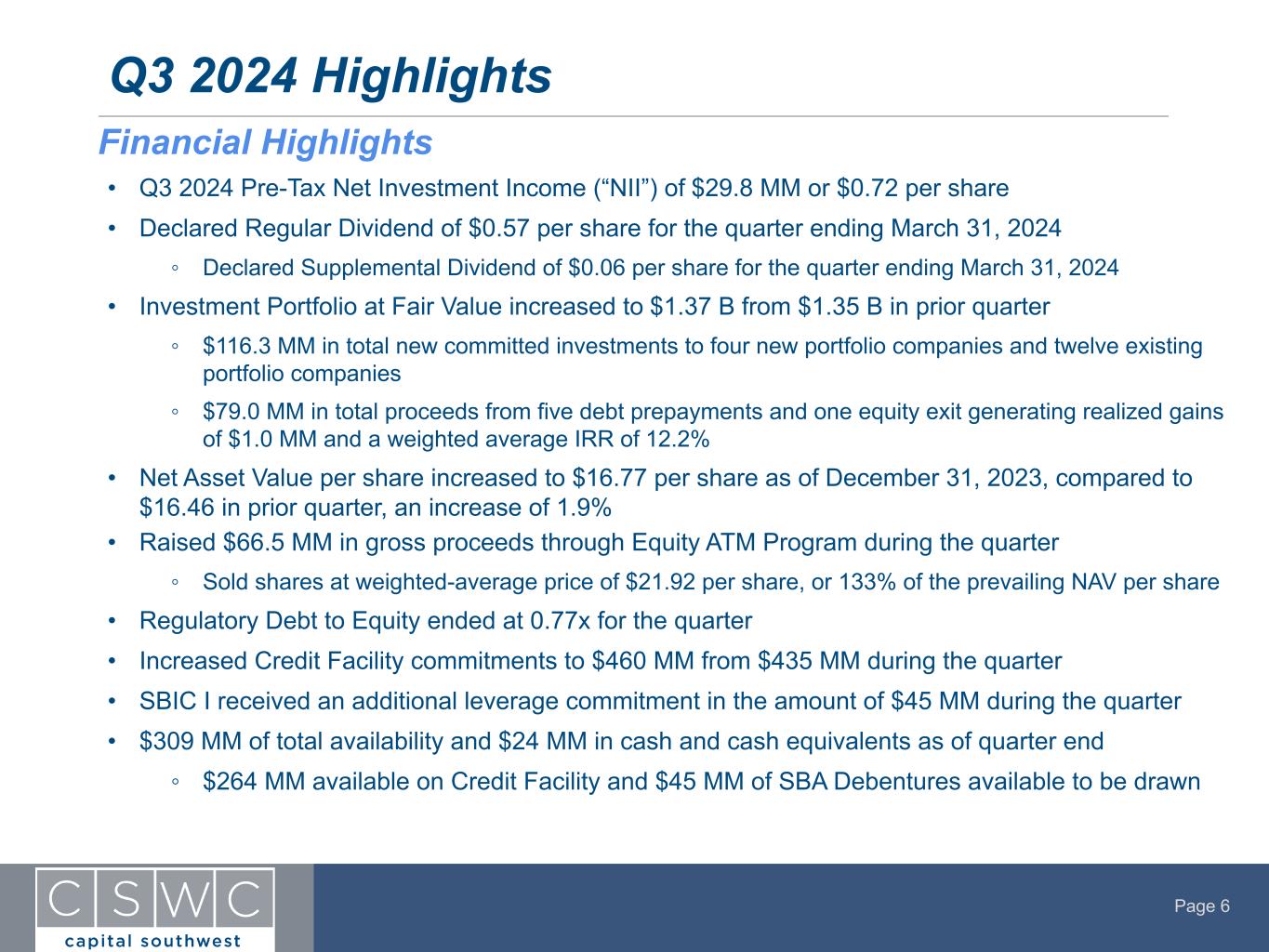 Q3 2024 Earnings Presentation 8333 Douglas Avenue, Suite 1100 | Dallas, Texas 75225 | 214.238.5700 | capitalsouthwest.com January 30, 2024 Capital Southwest Corporation