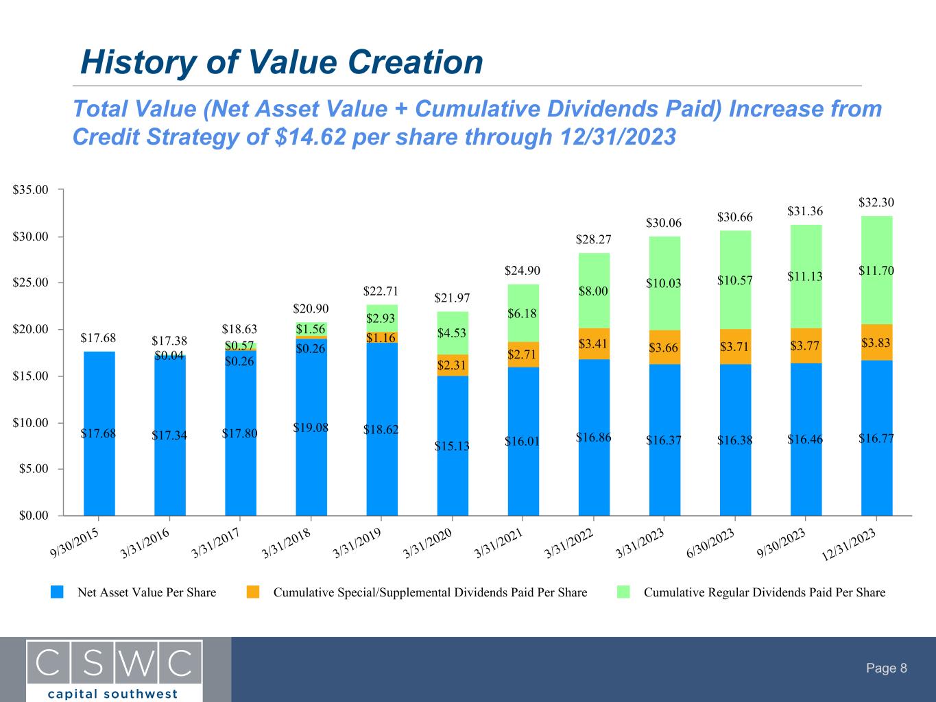 Page 7 • In the last twelve months ended 12/31/2023, CSWC generated $2.71 per share in Pre-Tax NII and paid out $2.20 per share in Regular Dividends ◦ LTM Pre-Tax NII Regular Dividend Coverage of 123% • Cumulative Pre-Tax NII Regular Dividend Coverage of 110% since launch of credit strategy in 2015 • Total of $3.89 per share Special and Supplemental Dividends declared since launch of credit strategy in 2015 • Estimated Undistributed Taxable Income ("UTI") of $0.52 per share as of December 31, 2023 Track Record of Consistent Dividends Continues Dividend Yield – Quarterly Annualized Total Dividend / CSWC Share Price at Qtr. End D iv id en d Pe r Sh ar e $0.44 $0.46 $0.48 $0.49 $0.50 $1.25 $0.51 $0.51 $0.51 $0.51 $0.52 $0.53 $0.54 $0.97 $0.48 $0.63 $0.50 $0.57 $0.58 $0.59 $0.62 $0.63 $0.63 $0.34 $0.36 $0.38 $0.39 $0.40 $0.40 $0.41 $0.41 $0.41 $0.41 $0.42 $0.43 $0.44 $0.47 $0.48 $0.48 $0.50 $0.52 $0.53 $0.54 $0.56 $0.57 $0.57 $0.10 $0.10 $0.10 $0.10 $0.10 $0.10 $0.10 $0.10 $0.10 $0.10 $0.10 $0.10 $0.10 $0.50 $0.05 $0.05 $0.05 $0.06 $0.06 $0.06 $0.75 $0.15 Regular Dividend Per Share Supplemental Dividend Per Share Special Dividend Per Share 9/30/2018 12/31/2018 3/31/2019 6/30/2019 9/30/2019 12/31/2019 3/31/2020 6/30/2020 9/30/2020 12/31/2020 3/31/2021 6/30/2021 9/30/2021 12/31/2021 3/31/2022 6/30/2022 9/30/2022 12/31/2022 3/31/2023 6/30/2023 9/30/2023 12/31/2023 3/31/2024 $0.00 $0.25 $0.50 $0.75 $1.00 $1.25 $1.50 9.3% 9.6% 9.1% 9.4% 9.2% 24.0% 17.9% 15.1% 14.5% 11.5% 9.4% 9.1% 8.6% 15.3% 8.1% 13.7% 13.3% 13.0% 11.8% 12.0% 10.8% 10.6%