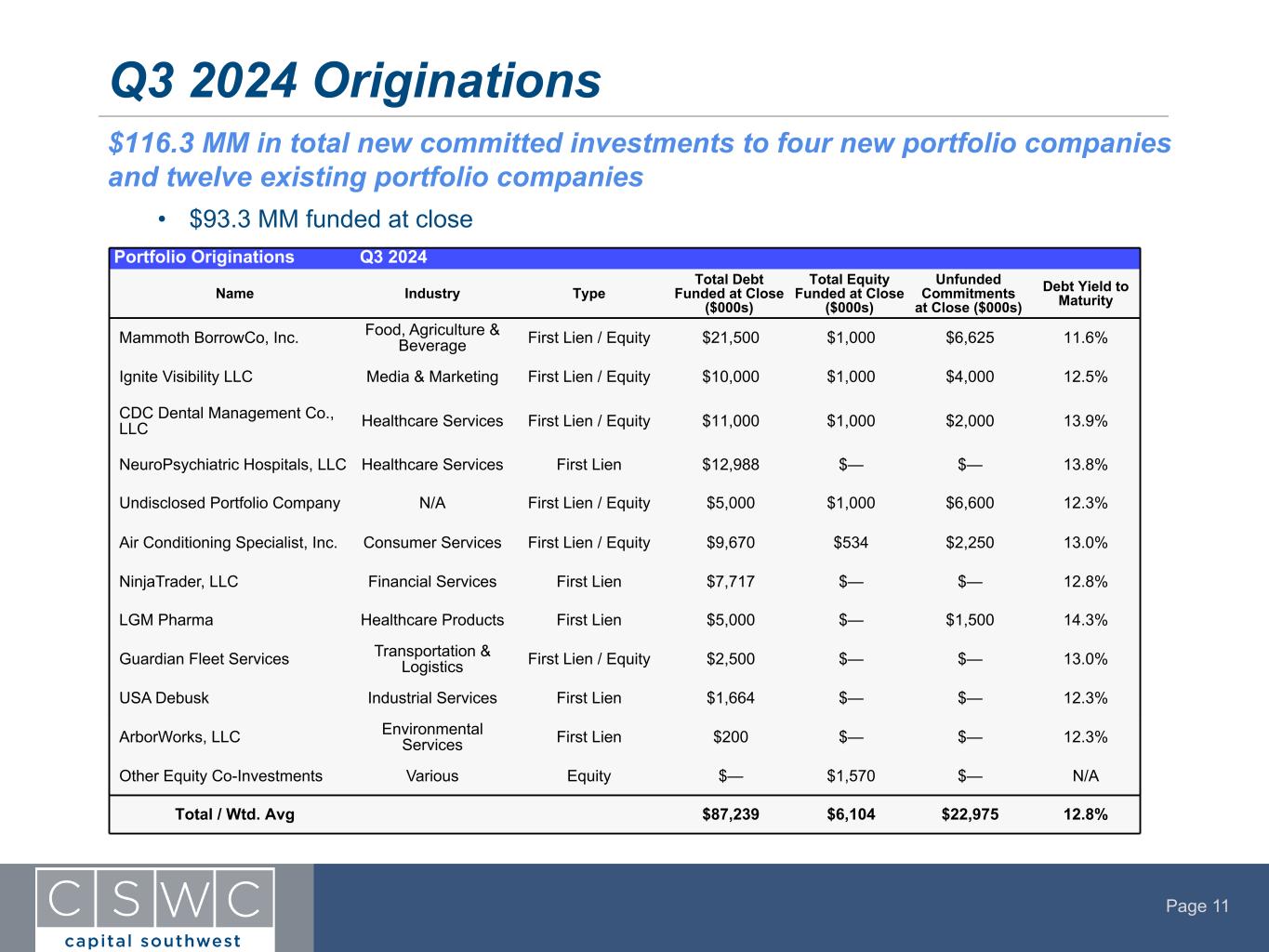 Page 11 $116.3 MM in total new committed investments to four new portfolio companies and twelve existing portfolio companies Q3 2024 Originations Portfolio Originations Q3 2024 Name Industry Type Total Debt Funded at Close ($000s) Total Equity Funded at Close ($000s) Unfunded Commitments at Close ($000s) Debt Yield to Maturity Mammoth BorrowCo, Inc. Food, Agriculture & Beverage First Lien / Equity $21,500 $1,000 $6,625 11.6% Ignite Visibility LLC Media & Marketing First Lien / Equity $10,000 $1,000 $4,000 12.5% CDC Dental Management Co., LLC Healthcare Services First Lien / Equity $11,000 $1,000 $2,000 13.9% NeuroPsychiatric Hospitals, LLC Healthcare Services First Lien $12,988 $— $— 13.8% Undisclosed Portfolio Company N/A First Lien / Equity $5,000 $1,000 $6,600 12.3% Air Conditioning Specialist, Inc. Consumer Services First Lien / Equity $9,670 $534 $2,250 13.0% NinjaTrader, LLC Financial Services First Lien $7,717 $— $— 12.8% LGM Pharma Healthcare Products First Lien $5,000 $— $1,500 14.3% Guardian Fleet Services Transportation & Logistics First Lien / Equity $2,500 $— $— 13.0% USA Debusk Industrial Services First Lien $1,664 $— $— 12.3% ArborWorks, LLC Environmental Services First Lien $200 $— $— 12.3% Other Equity Co-Investments Various Equity $— $1,570 $— N/A Total / Wtd. Avg $87,239 $6,104 $22,975 12.8% • $93.3 MM funded at close