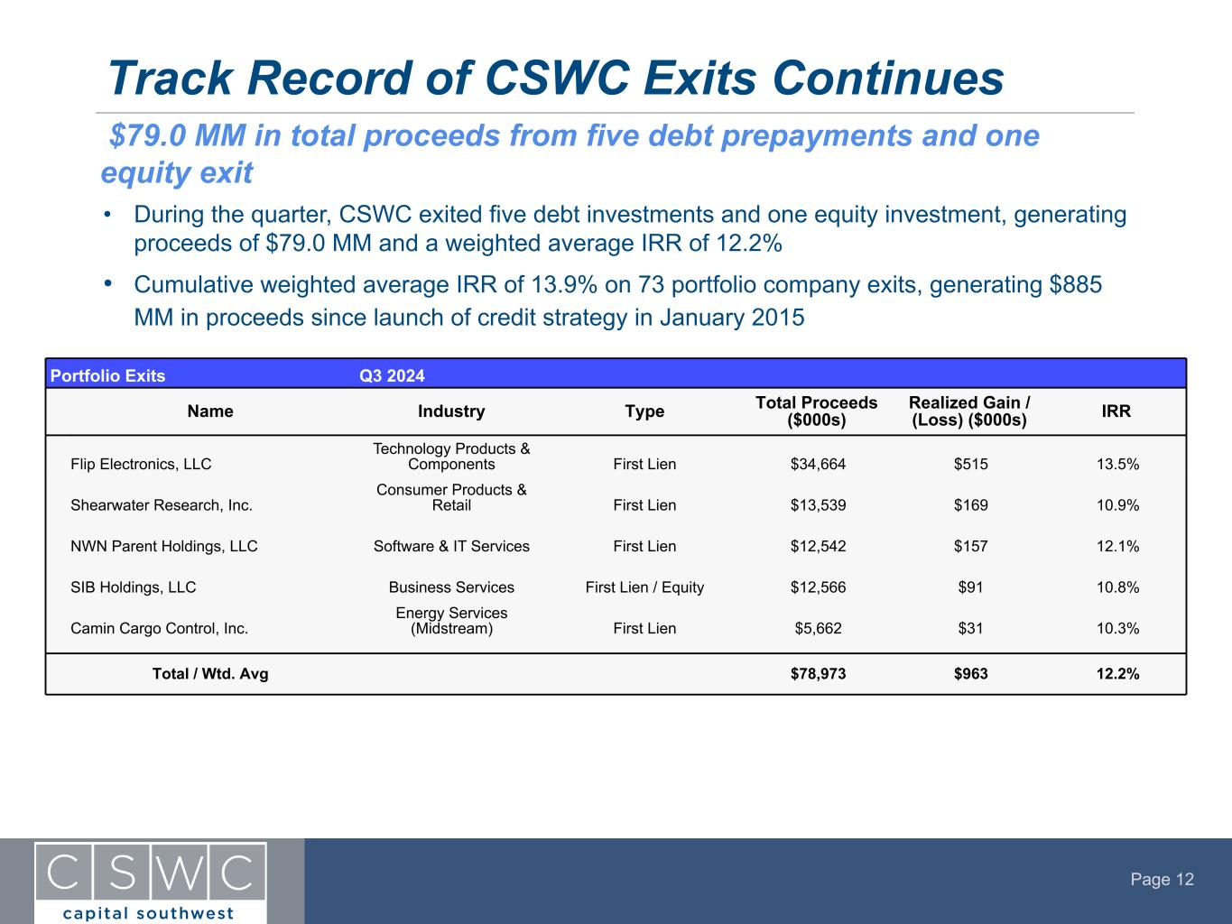 Page 12 Portfolio Exits Q3 2024 Name Industry Type Total Proceeds ($000s) Realized Gain / (Loss) ($000s) IRR Flip Electronics, LLC Technology Products & Components First Lien $34,664 $515 13.5% Shearwater Research, Inc. Consumer Products & Retail First Lien $13,539 $169 10.9% NWN Parent Holdings, LLC Software & IT Services First Lien $12,542 $157 12.1% SIB Holdings, LLC Business Services First Lien / Equity $12,566 $91 10.8% Camin Cargo Control, Inc. Energy Services (Midstream) First Lien $5,662 $31 10.3% Total / Wtd. Avg $78,973 $963 12.2% Track Record of CSWC Exits Continues • During the quarter, CSWC exited five debt investments and one equity investment, generating proceeds of $79.0 MM and a weighted average IRR of 12.2% • Cumulative weighted average IRR of 13.9% on 73 portfolio company exits, generating $885 MM in proceeds since launch of credit strategy in January 2015 $79.0 MM in total proceeds from five debt prepayments and one equity exit