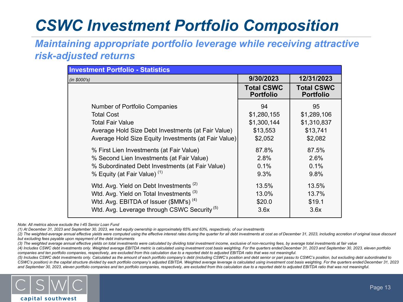 Page 22 Portfolio Statistics (1) CSWC utilizes an internal 1 - 4 investment rating system in which 1 represents material outperformance and 4 represents material underperformance. All new investments are initially set to 2. Weighted average investment rating is calculated at cost. (2) Excludes CSWC equity investment in I-45 SLF (3) At Fair Value Continuing to build a well performing credit portfolio (In Thousands) Quarter Ended 3/31/23 Quarter Ended 6/30/23 Quarter Ended 9/30/23 Quarter Ended 12/31/23 Portfolio Statistics Fair Value of Debt Investments $1,037,595 $1,110,915 $1,179,074 $1,181,737 Average Debt Investment Hold Size $13,303 $13,548 $13,553 $13,741 Fair Value of Debt Investments as a % of Par 96% 97% 97% 97% % of Investment Portfolio on Non-Accrual (at Fair Value) 0.3% 1.7% 2.0% 2.2% Weighted Average Investment Rating (1) 1.93 1.91 1.92 1.91 Weighted Average Yield on Debt Investments 12.78% 12.94% 13.50% 13.53% Fair Value of All Portfolio Investments $1,206,388 $1,285,318 $1,353,566 $1,365,037 Weighted Average Yield on all Portfolio Investments 12.11% 12.64% 12.97% 13.74% Investment Mix (Debt vs. Equity) (2)(3) 90% / 10% 90% / 10% 90% / 10% 90% / 10%