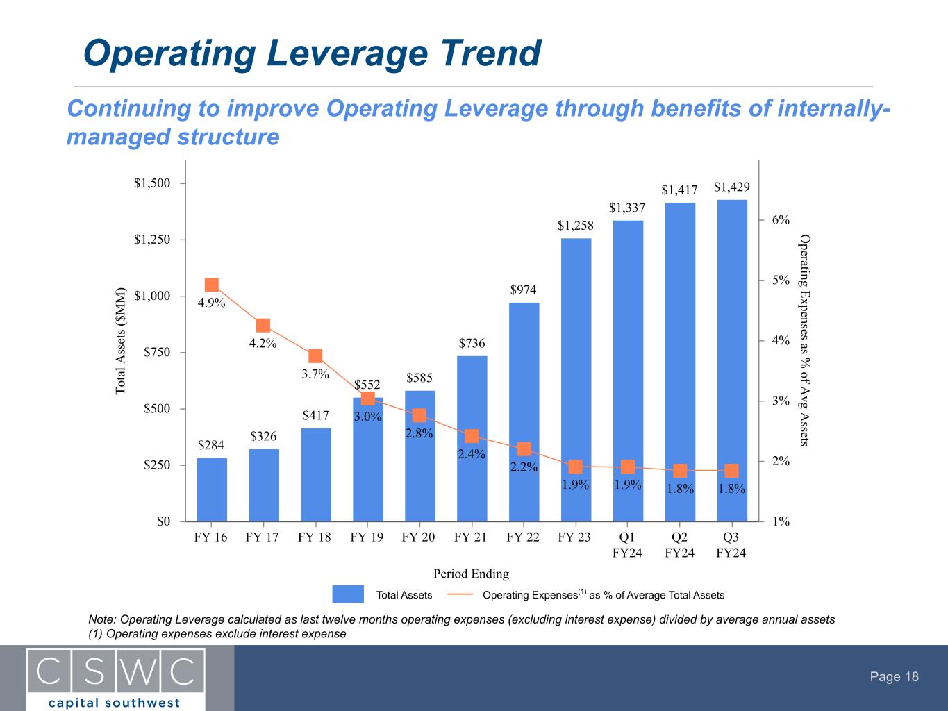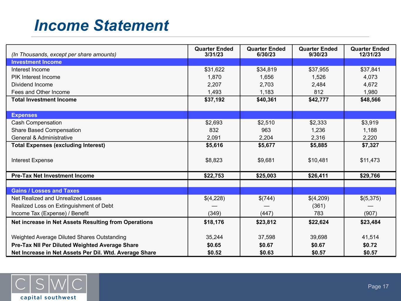 Page 17 Income Statement (In Thousands, except per share amounts) Quarter Ended 3/31/23 Quarter Ended 6/30/23 Quarter Ended 9/30/23 Quarter Ended 12/31/23 Investment Income Interest Income $31,622 $34,819 $37,955 $37,841 PIK Interest Income 1,870 1,656 1,526 4,073 Dividend Income 2,207 2,703 2,484 4,672 Fees and Other Income 1,493 1,183 812 1,980 Total Investment Income $37,192 $40,361 $42,777 $48,566 Expenses Cash Compensation $2,693 $2,510 $2,333 $3,919 Share Based Compensation 832 963 1,236 1,188 General & Administrative 2,091 2,204 2,316 2,220 Total Expenses (excluding Interest) $5,616 $5,677 $5,885 $7,327 Interest Expense $8,823 $9,681 $10,481 $11,473 Pre-Tax Net Investment Income $22,753 $25,003 $26,411 $29,766 Gains / Losses and Taxes Net Realized and Unrealized Losses $(4,228) $(744) $(4,209) $(5,375) Realized Loss on Extinguishment of Debt — — (361) — Income Tax (Expense) / Benefit (349) (447) 783 (907) Net increase in Net Assets Resulting from Operations $18,176 $23,812 $22,624 $23,484 Weighted Average Diluted Shares Outstanding 35,244 37,598 39,698 41,514 Pre-Tax NII Per Diluted Weighted Average Share $0.65 $0.67 $0.67 $0.72 Net Increase in Net Assets Per Dil. Wtd. Average Share $0.52 $0.63 $0.57 $0.57