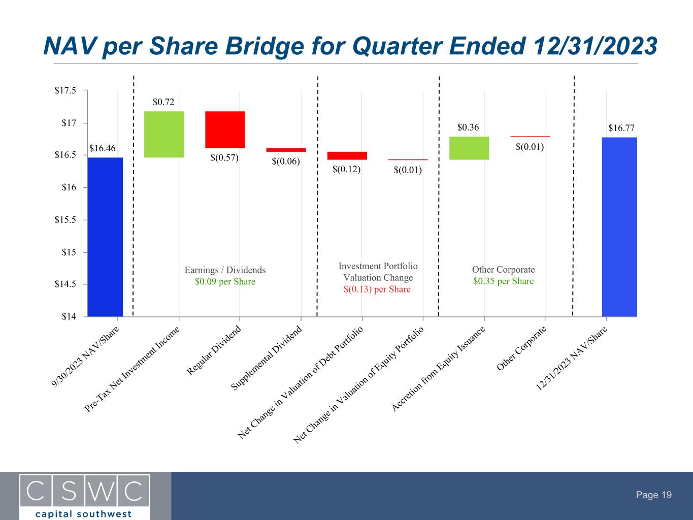 Page 19 $16.46 $0.72 $(0.57) $(0.06) $(0.12) $(0.01) $0.36 $(0.01) $16.77 9/3 0/2 02 3 N AV/Shar e Pre- Tax Net I nv est ment In com e Regu lar Divi den d Sup ple ment al D ivi den d Net C han ge in Valu ati on of Debt Port fol io Net C han ge in Valu ati on of Equ ity Port fol io Accr eti on fro m Equ ity Iss uan ce Othe r C orp ora te 12 /31 /20 23 NAV/Shar e $14 $14.5 $15 $15.5 $16 $16.5 $17 $17.5 NAV per Share Bridge for Quarter Ended 12/31/2023 Earnings / Dividends $0.09 per Share Investment Portfolio Valuation Change $(0.13) per Share Other Corporate $0.35 per Share