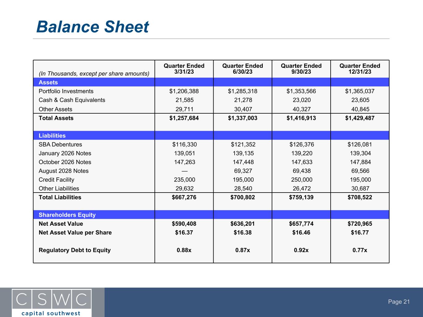 Page 21 Balance Sheet (In Thousands, except per share amounts) Quarter Ended 3/31/23 Quarter Ended 6/30/23 Quarter Ended 9/30/23 Quarter Ended 12/31/23 Assets Portfolio Investments $1,206,388 $1,285,318 $1,353,566 $1,365,037 Cash & Cash Equivalents 21,585 21,278 23,020 23,605 Other Assets 29,711 30,407 40,327 40,845 Total Assets $1,257,684 $1,337,003 $1,416,913 $1,429,487 Liabilities SBA Debentures $116,330 $121,352 $126,376 $126,081 January 2026 Notes 139,051 139,135 139,220 139,304 October 2026 Notes 147,263 147,448 147,633 147,884 August 2028 Notes — 69,327 69,438 69,566 Credit Facility 235,000 195,000 250,000 195,000 Other Liabilities 29,632 28,540 26,472 30,687 Total Liabilities $667,276 $700,802 $759,139 $708,522 Shareholders Equity Net Asset Value $590,408 $636,201 $657,774 $720,965 Net Asset Value per Share $16.37 $16.38 $16.46 $16.77 Regulatory Debt to Equity 0.88x 0.87x 0.92x 0.77x