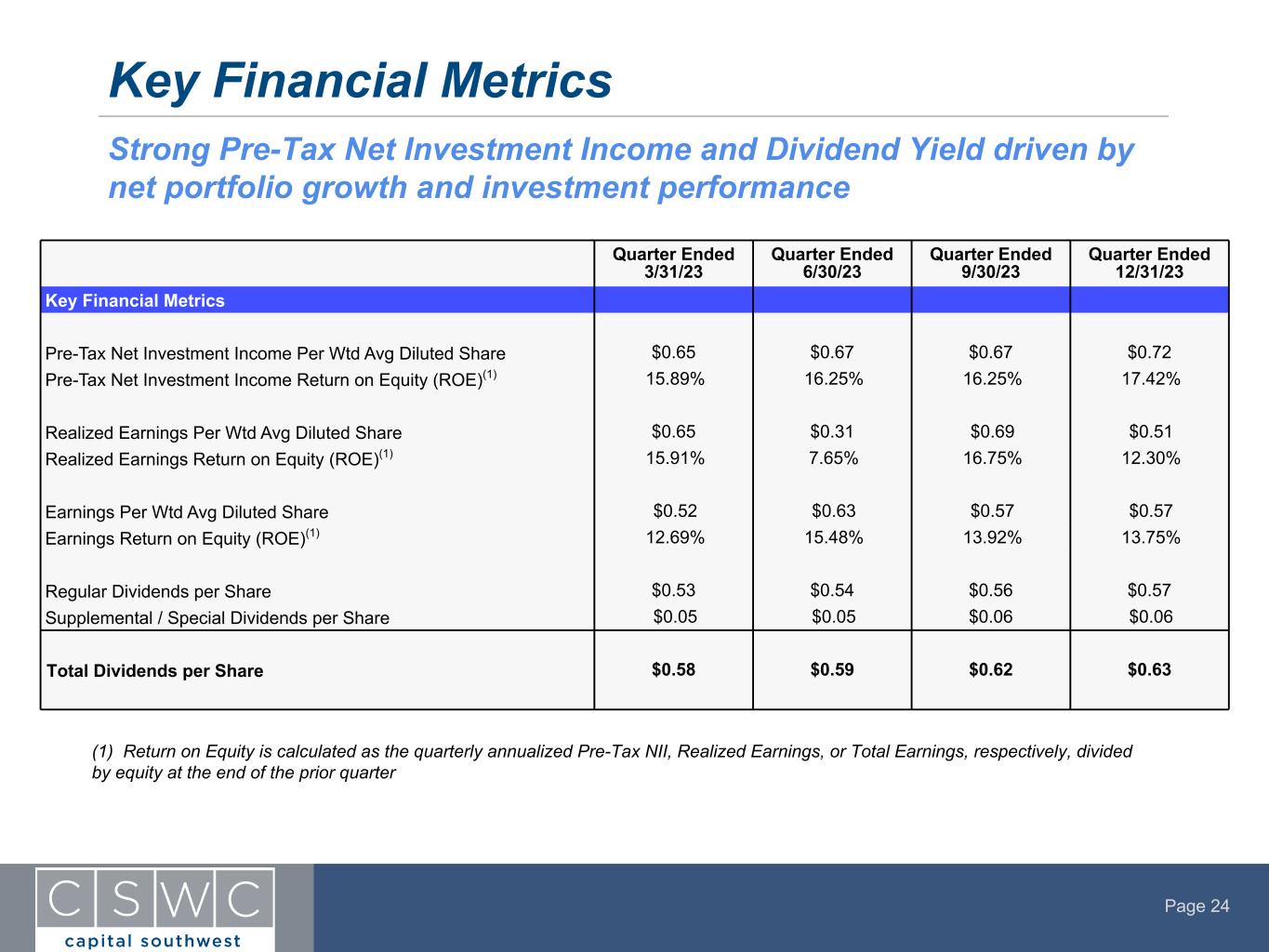 Page 23 Investment Income Detail Constructing a portfolio of investments with recurring cash yield (In Thousands) Quarter Ended 3/31/23 Quarter Ended 6/30/23 Quarter Ended 9/30/23 Quarter Ended 12/31/23 Investment Income Breakdown Cash Interest $30,712 $33,703 $36,588 $36,743 Cash Dividends 2,208 2,703 2,484 4,672 PIK Income 1,869 1,656 1,526 4,073 Amortization of Purchase Discounts and Fees 969 1,172 1,447 1,292 Management/Admin Fees 369 380 401 467 Prepayment Fees & Other Income 1,065 747 331 1,319 Total Investment Income $37,192 $40,361 $42,777 $48,566 Key Metrics Cash Income as a % of Investment Income (1) 95% 96% 96% 92% % of Total Investment Income that is Recurring 97% 98% 99% 93% (1) Includes Purchase Discounts and Fees previously received in cash