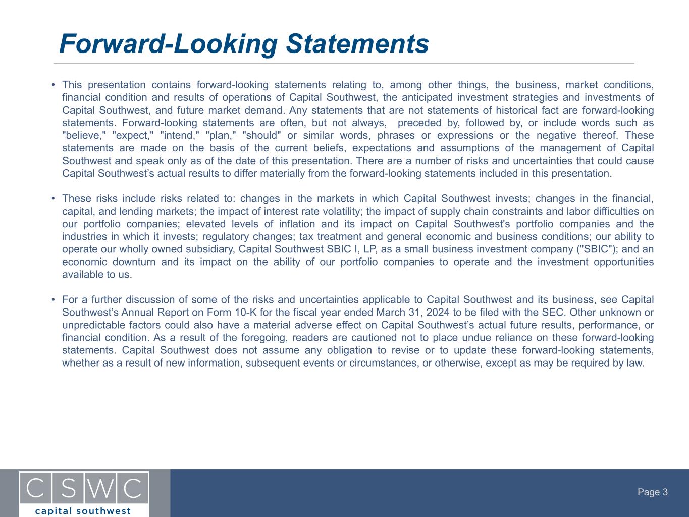 Page 2 Important Notices • These materials and any presentation of which they form a part are neither an offer to sell, nor a solicitation of an offer to purchase, any securities of Capital Southwest. • These materials and the presentations of which they are a part, and the summaries contained herein, do not purport to be complete and no obligation to update or otherwise revise such information is being assumed. Nothing shall be relied upon as a promise or representation as to the future performance of Capital Southwest. Such information is qualified in its entirety by reference to the more detailed discussions contained elsewhere in Capital Southwest’s public filings with the Securities and Exchange Commission (the "SEC"). • There is no guarantee that any of the estimates, targets or projections illustrated in these materials and any presentation of which they form a part will be achieved. Any references herein to any of the Capital Southwest’s past or present investments or its past or present performance, have been provided for illustrative purposes only. It should not be assumed that these investments were or will be profitable or that any future investments by Capital Southwest will be profitable or will equal the performance of these investments. • The information contained herein has been derived from financial statements and other documents provided by the portfolio companies unless otherwise stated. • Past performance is not indicative of future results. In addition, there can be no assurance that unrealized investments will be realized at the expected multiples shown as actual realized returns will depend on, among other factors, future operating results of each of Capital Southwest’s current portfolio companies, the value of the assets and economic conditions at the time of disposition, any related transaction costs, and the timing and manner of sale, all of which may differ from the assumptions on which Capital Southwest’s expected returns are based. In many instances, Capital Southwest will not determine the timing or manner of sale of its portfolio companies. • Capital Southwest has filed a registration statement (which contains the prospectus) with the SEC for any offering to which this communication may relate and may file one or more prospectus supplements to the prospectus in the future. Before you invest in any of Capital Southwest's securities, you should read the registration statement and the applicable prospectus and prospectus supplement(s), including the information incorporated by reference therein, in order to fully understand all of the implications and risks of an offering of Capital Southwest's securities. You should also read other documents Capital Southwest has filed with the SEC for more complete information about Capital Southwest and any offering of its securities. You may get these documents for free by visiting EDGAR on the SEC's website at www.sec.gov. Alternatively, Capital Southwest will arrange to send you any applicable prospectus and prospectus supplement(s) if you request such materials by calling us at (214) 238-5700. These materials are also made available, free of charge, on our website at www.capitalsouthwest.com. Information contained on our website is not incorporated by reference into this communication.