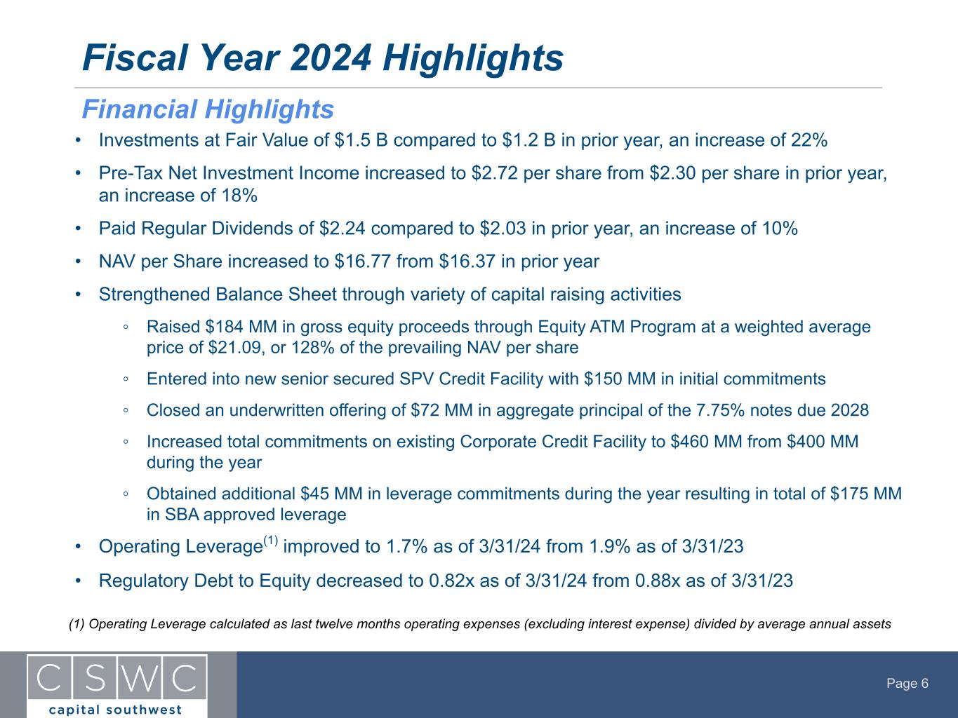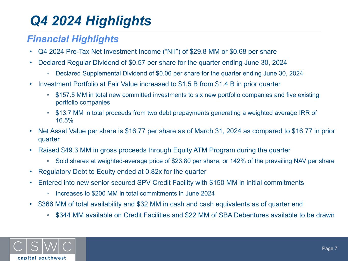 Page 6 Fiscal Year 2024 Highlights Financial Highlights (1) Operating Leverage calculated as last twelve months operating expenses (excluding interest expense) divided by average annual assets • Investments at Fair Value of $1.5 B compared to $1.2 B in prior year, an increase of 22% • Pre-Tax Net Investment Income increased to $2.72 per share from $2.30 per share in prior year, an increase of 18% • Paid Regular Dividends of $2.24 compared to $2.03 in prior year, an increase of 10% • NAV per Share increased to $16.77 from $16.37 in prior year • Strengthened Balance Sheet through variety of capital raising activities ◦ Raised $184 MM in gross equity proceeds through Equity ATM Program at a weighted average price of $21.09, or 128% of the prevailing NAV per share ◦ Entered into new senior secured SPV Credit Facility with $150 MM in initial commitments ◦ Closed an underwritten offering of $72 MM in aggregate principal of the 7.75% notes due 2028 ◦ Increased total commitments on existing Corporate Credit Facility to $460 MM from $400 MM during the year ◦ Obtained additional $45 MM in leverage commitments during the year resulting in total of $175 MM in SBA approved leverage • Operating Leverage(1) improved to 1.7% as of 3/31/24 from 1.9% as of 3/31/23 • Regulatory Debt to Equity decreased to 0.82x as of 3/31/24 from 0.88x as of 3/31/23
