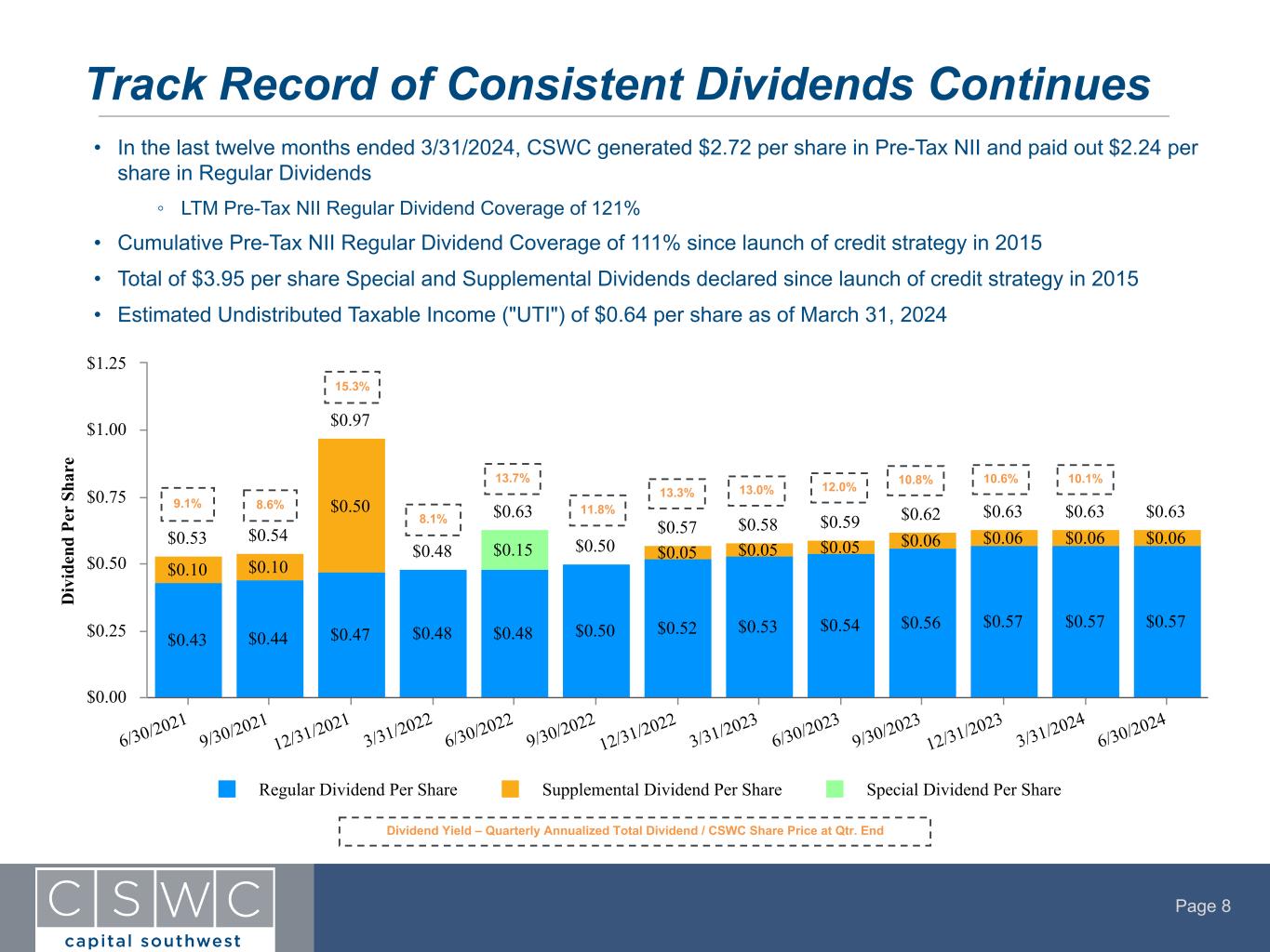 Page 7 • Q4 2024 Pre-Tax Net Investment Income (“NII”) of $29.8 MM or $0.68 per share • Declared Regular Dividend of $0.57 per share for the quarter ending June 30, 2024 ◦ Declared Supplemental Dividend of $0.06 per share for the quarter ending June 30, 2024 • Investment Portfolio at Fair Value increased to $1.5 B from $1.4 B in prior quarter ◦ $157.5 MM in total new committed investments to six new portfolio companies and five existing portfolio companies ◦ $13.7 MM in total proceeds from two debt prepayments generating a weighted average IRR of 16.5% • Net Asset Value per share is $16.77 per share as of March 31, 2024 as compared to $16.77 in prior quarter • Raised $49.3 MM in gross proceeds through Equity ATM Program during the quarter ◦ Sold shares at weighted-average price of $23.80 per share, or 142% of the prevailing NAV per share • Regulatory Debt to Equity ended at 0.82x for the quarter • Entered into new senior secured SPV Credit Facility with $150 MM in initial commitments ◦ Increases to $200 MM in total commitments in June 2024 • $366 MM of total availability and $32 MM in cash and cash equivalents as of quarter end ◦ $344 MM available on Credit Facilities and $22 MM of SBA Debentures available to be drawn Q4 2024 Highlights Financial Highlights