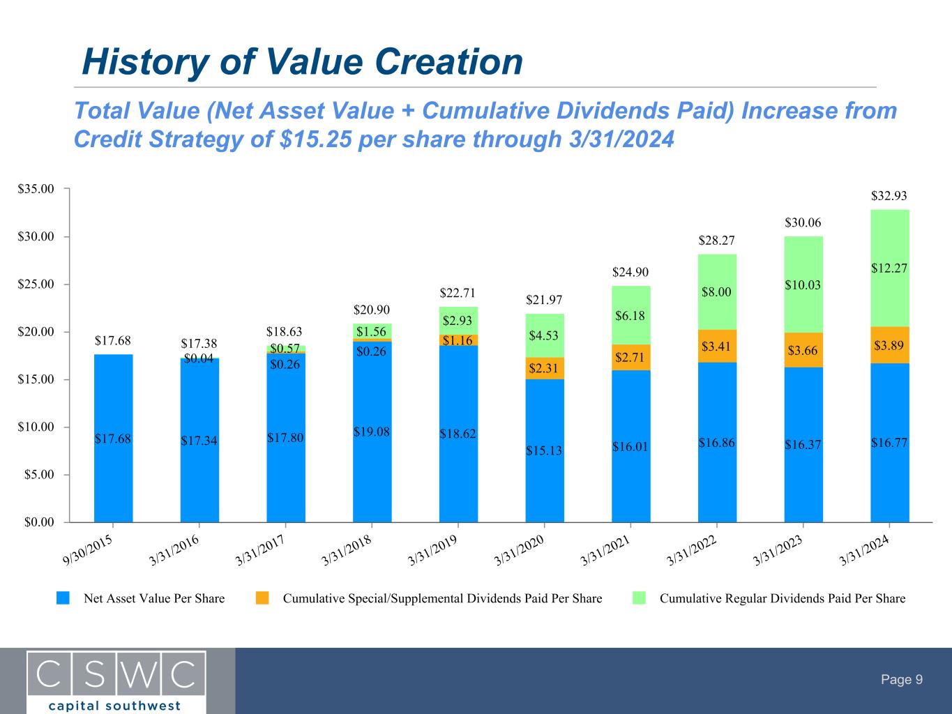 Page 8 • In the last twelve months ended 3/31/2024, CSWC generated $2.72 per share in Pre-Tax NII and paid out $2.24 per share in Regular Dividends ◦ LTM Pre-Tax NII Regular Dividend Coverage of 121% • Cumulative Pre-Tax NII Regular Dividend Coverage of 111% since launch of credit strategy in 2015 • Total of $3.95 per share Special and Supplemental Dividends declared since launch of credit strategy in 2015 • Estimated Undistributed Taxable Income ("UTI") of $0.64 per share as of March 31, 2024 Track Record of Consistent Dividends Continues Dividend Yield – Quarterly Annualized Total Dividend / CSWC Share Price at Qtr. End D iv id en d Pe r Sh ar e $0.53 $0.54 $0.97 $0.48 $0.63 $0.50 $0.57 $0.58 $0.59 $0.62 $0.63 $0.63 $0.63 $0.43 $0.44 $0.47 $0.48 $0.48 $0.50 $0.52 $0.53 $0.54 $0.56 $0.57 $0.57 $0.57 $0.10 $0.10 $0.50 $0.05 $0.05 $0.05 $0.06 $0.06 $0.06 $0.06 $0.15 Regular Dividend Per Share Supplemental Dividend Per Share Special Dividend Per Share 6/30/2021 9/30/2021 12/31/2021 3/31/2022 6/30/2022 9/30/2022 12/31/2022 3/31/2023 6/30/2023 9/30/2023 12/31/2023 3/31/2024 6/30/2024 $0.00 $0.25 $0.50 $0.75 $1.00 $1.25 9.1% 8.6% 15.3% 8.1% 13.7% 13.3% 13.0% 11.8% 12.0% 10.8% 10.6% 10.1%