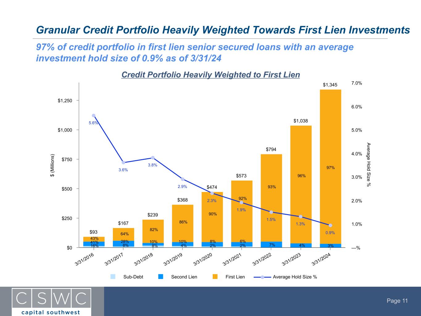 Page 10 CSWC leads financing transactions, primarily backing private equity firms that generally fit the following parameters • Flexible financing solutions to fund growth, changes of control, or other corporate events • Investments are diverse among industries, geographic regions, and end markets • Companies with EBITDA between $3 MM and $25 MM • Typical leverage of 2.5x – 4.5x Debt to EBITDA through CSWC debt position and Loan-to-Value of 25% - 50% • Commitment size up to $50 MM with hold sizes generally $5 MM to $35 MM • Both sponsored and non-sponsored deals • Floating rate first lien debt securities • Frequently make equity co-investments alongside CSWC debt Lower Middle Market Credit Strategy