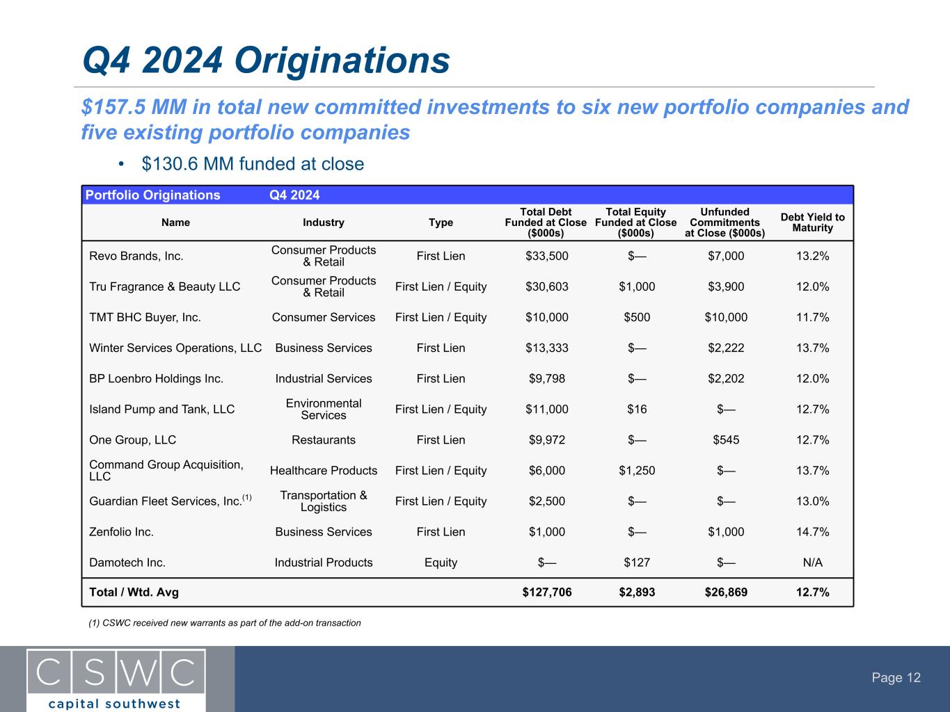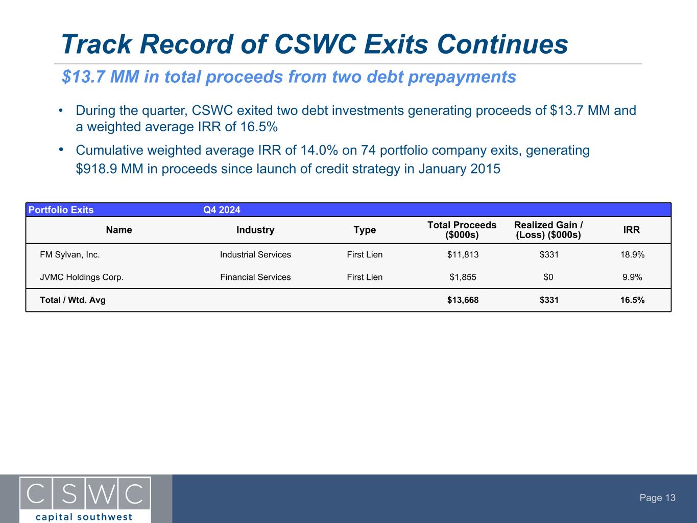 Page 12 $157.5 MM in total new committed investments to six new portfolio companies and five existing portfolio companies Q4 2024 Originations Portfolio Originations Q4 2024 Name Industry Type Total Debt Funded at Close ($000s) Total Equity Funded at Close ($000s) Unfunded Commitments at Close ($000s) Debt Yield to Maturity Revo Brands, Inc. Consumer Products & Retail First Lien $33,500 $— $7,000 13.2% Tru Fragrance & Beauty LLC Consumer Products & Retail First Lien / Equity $30,603 $1,000 $3,900 12.0% TMT BHC Buyer, Inc. Consumer Services First Lien / Equity $10,000 $500 $10,000 11.7% Winter Services Operations, LLC Business Services First Lien $13,333 $— $2,222 13.7% BP Loenbro Holdings Inc. Industrial Services First Lien $9,798 $— $2,202 12.0% Island Pump and Tank, LLC Environmental Services First Lien / Equity $11,000 $16 $— 12.7% One Group, LLC Restaurants First Lien $9,972 $— $545 12.7% Command Group Acquisition, LLC Healthcare Products First Lien / Equity $6,000 $1,250 $— 13.7% Guardian Fleet Services, Inc.(1) Transportation & Logistics First Lien / Equity $2,500 $— $— 13.0% Zenfolio Inc. Business Services First Lien $1,000 $— $1,000 14.7% Damotech Inc. Industrial Products Equity $— $127 $— N/A Total / Wtd. Avg $127,706 $2,893 $26,869 12.7% • $130.6 MM funded at close (1) CSWC received new warrants as part of the add-on transaction