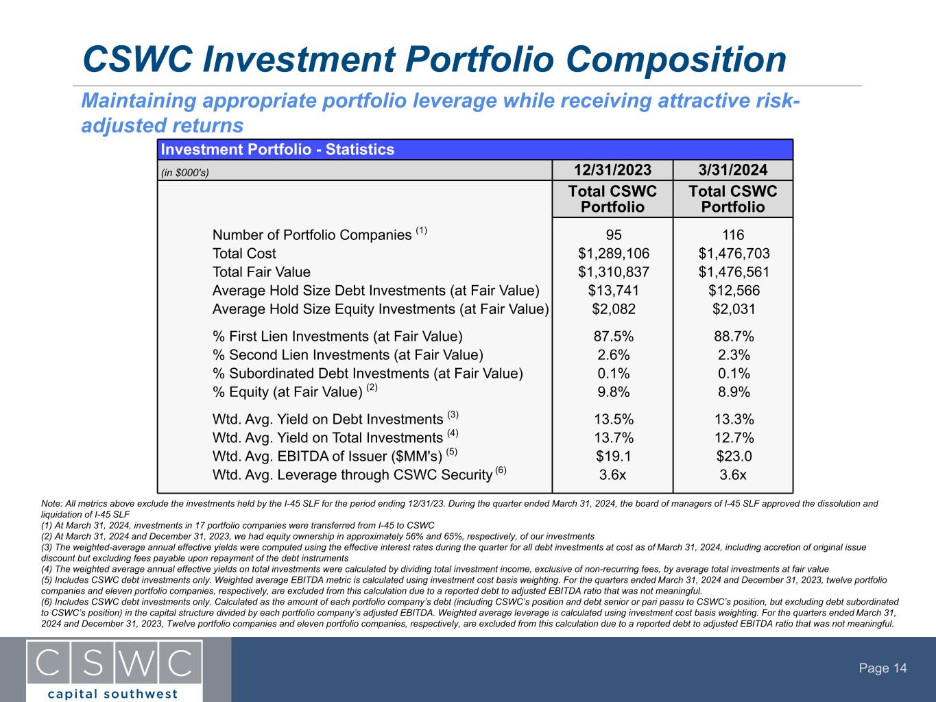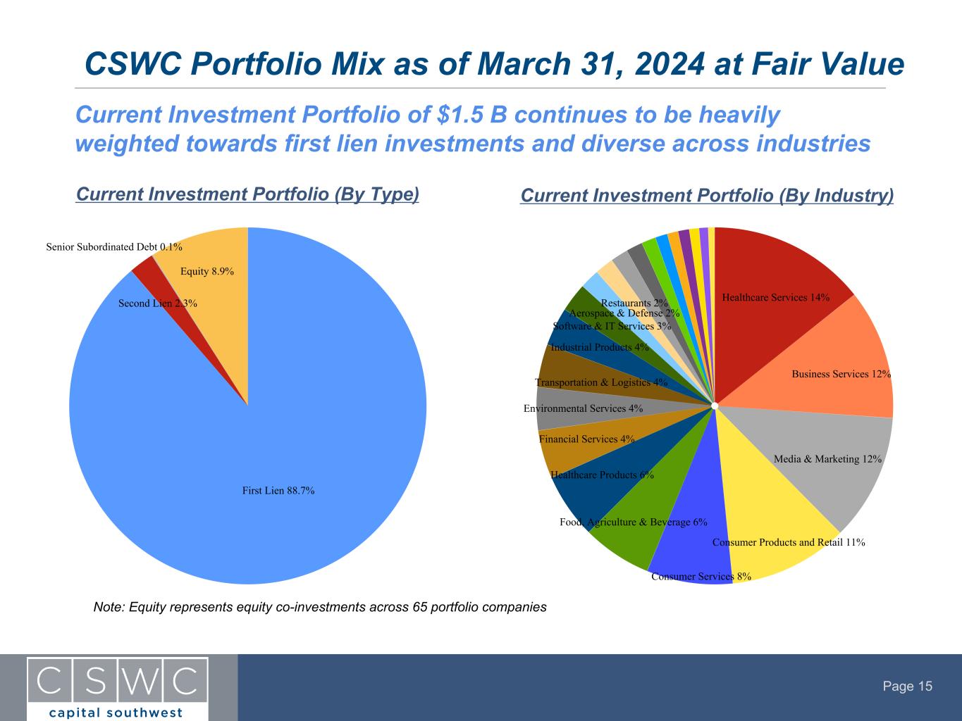 Page 14 CSWC Investment Portfolio Composition Note: All metrics above exclude the investments held by the I-45 SLF for the period ending 12/31/23. During the quarter ended March 31, 2024, the board of managers of I-45 SLF approved the dissolution and liquidation of I-45 SLF (1) At March 31, 2024, investments in 17 portfolio companies were transferred from I-45 to CSWC (2) At March 31, 2024 and December 31, 2023, we had equity ownership in approximately 56% and 65%, respectively, of our investments (3) The weighted-average annual effective yields were computed using the effective interest rates during the quarter for all debt investments at cost as of March 31, 2024, including accretion of original issue discount but excluding fees payable upon repayment of the debt instruments (4) The weighted average annual effective yields on total investments were calculated by dividing total investment income, exclusive of non-recurring fees, by average total investments at fair value (5) Includes CSWC debt investments only. Weighted average EBITDA metric is calculated using investment cost basis weighting. For the quarters ended March 31, 2024 and December 31, 2023, twelve portfolio companies and eleven portfolio companies, respectively, are excluded from this calculation due to a reported debt to adjusted EBITDA ratio that was not meaningful. (6) Includes CSWC debt investments only. Calculated as the amount of each portfolio company’s debt (including CSWC’s position and debt senior or pari passu to CSWC’s position, but excluding debt subordinated to CSWC’s position) in the capital structure divided by each portfolio company’s adjusted EBITDA. Weighted average leverage is calculated using investment cost basis weighting. For the quarters ended March 31, 2024 and December 31, 2023, Twelve portfolio companies and eleven portfolio companies, respectively, are excluded from this calculation due to a reported debt to adjusted EBITDA ratio that was not meaningful. Maintaining appropriate portfolio leverage while receiving attractive risk- adjusted returns Investment Portfolio - Statistics (in $000's) 12/31/2023 3/31/2024 Total CSWC Portfolio Total CSWC Portfolio Number of Portfolio Companies (1) 95 116 Total Cost $1,289,106 $1,476,703 Total Fair Value $1,310,837 $1,476,561 Average Hold Size Debt Investments (at Fair Value) $13,741 $12,566 Average Hold Size Equity Investments (at Fair Value) $2,082 $2,031 % First Lien Investments (at Fair Value) 87.5% 88.7% % Second Lien Investments (at Fair Value) 2.6% 2.3% % Subordinated Debt Investments (at Fair Value) 0.1% 0.1% % Equity (at Fair Value) (2) 9.8% 8.9% Wtd. Avg. Yield on Debt Investments (3) 13.5% 13.3% Wtd. Avg. Yield on Total Investments (4) 13.7% 12.7% Wtd. Avg. EBITDA of Issuer ($MM's) (5) $19.1 $23.0 Wtd. Avg. Leverage through CSWC Security (6) 3.6x 3.6x