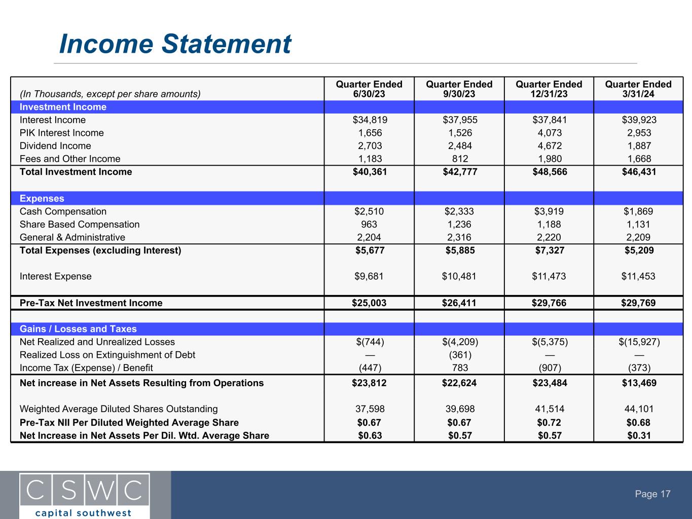 Page 17 Income Statement (In Thousands, except per share amounts) Quarter Ended 6/30/23 Quarter Ended 9/30/23 Quarter Ended 12/31/23 Quarter Ended 3/31/24 Investment Income Interest Income $34,819 $37,955 $37,841 $39,923 PIK Interest Income 1,656 1,526 4,073 2,953 Dividend Income 2,703 2,484 4,672 1,887 Fees and Other Income 1,183 812 1,980 1,668 Total Investment Income $40,361 $42,777 $48,566 $46,431 Expenses Cash Compensation $2,510 $2,333 $3,919 $1,869 Share Based Compensation 963 1,236 1,188 1,131 General & Administrative 2,204 2,316 2,220 2,209 Total Expenses (excluding Interest) $5,677 $5,885 $7,327 $5,209 Interest Expense $9,681 $10,481 $11,473 $11,453 Pre-Tax Net Investment Income $25,003 $26,411 $29,766 $29,769 Gains / Losses and Taxes Net Realized and Unrealized Losses $(744) $(4,209) $(5,375) $(15,927) Realized Loss on Extinguishment of Debt — (361) — — Income Tax (Expense) / Benefit (447) 783 (907) (373) Net increase in Net Assets Resulting from Operations $23,812 $22,624 $23,484 $13,469 Weighted Average Diluted Shares Outstanding 37,598 39,698 41,514 44,101 Pre-Tax NII Per Diluted Weighted Average Share $0.67 $0.67 $0.72 $0.68 Net Increase in Net Assets Per Dil. Wtd. Average Share $0.63 $0.57 $0.57 $0.31