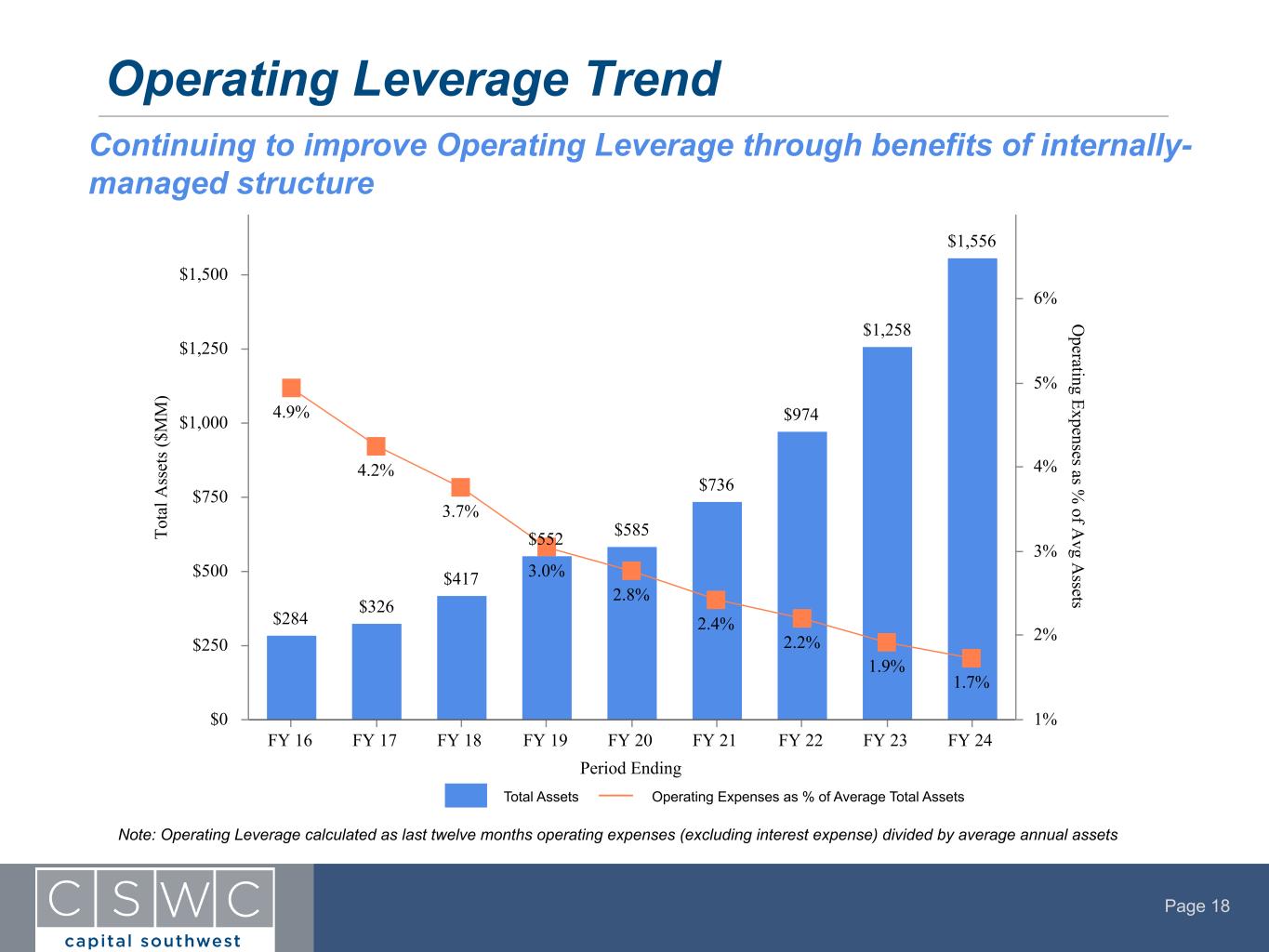 Page 18 Operating Leverage Trend Continuing to improve Operating Leverage through benefits of internally- managed structure Period Ending To ta l A ss et s ( $M M ) O perating Expenses as % of A vg A ssets $284 $326 $417 $552 $585 $736 $974 $1,258 $1,556 4.9% 4.2% 3.7% 3.0% 2.8% 2.4% 2.2% 1.9% 1.7% FY 16 FY 17 FY 18 FY 19 FY 20 FY 21 FY 22 FY 23 FY 24 $0 $250 $500 $750 $1,000 $1,250 $1,500 1% 2% 3% 4% 5% 6% Total Assets Operating Expenses as % of Average Total Assets Note: Operating Leverage calculated as last twelve months operating expenses (excluding interest expense) divided by average annual assets