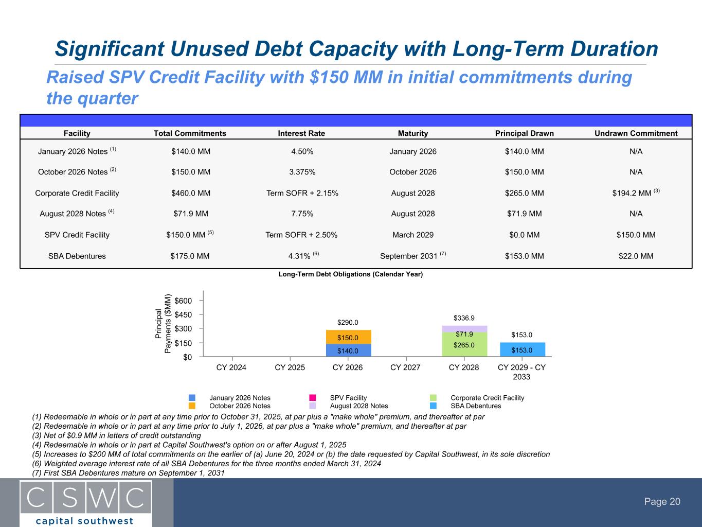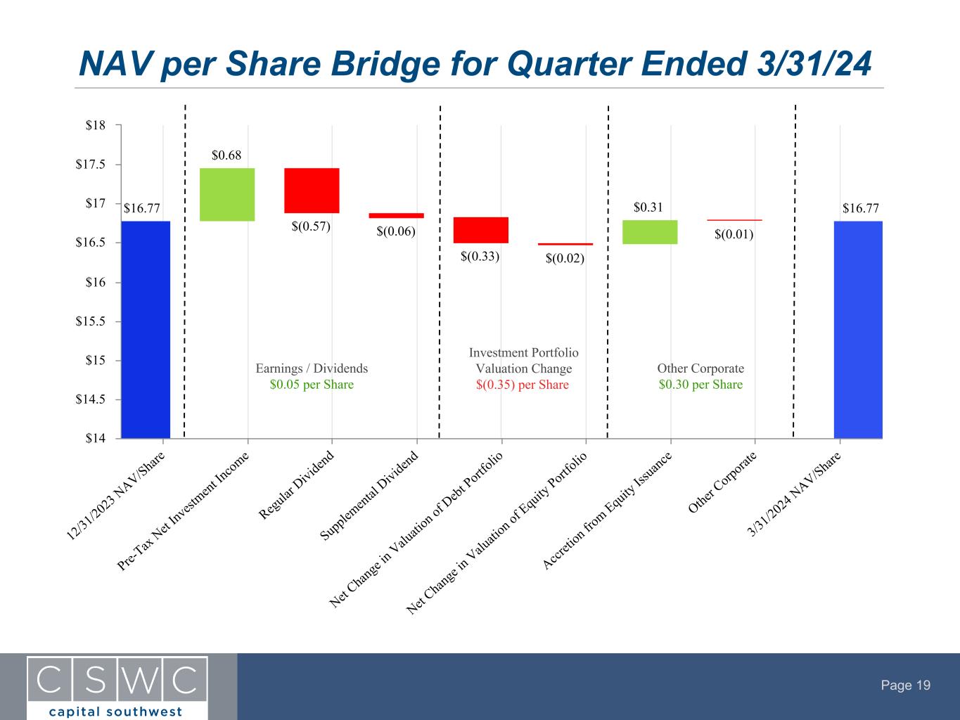 Page 19 $16.77 $0.68 $(0.57) $(0.06) $(0.33) $(0.02) $0.31 $(0.01) $16.77 12 /31 /20 23 NAV/Shar e Pre- Tax Net I nv est ment In com e Regu lar Divi den d Sup ple ment al D ivi den d Net C han ge in Valu ati on of Debt Port fol io Net C han ge in Valu ati on of Equ ity Port fol io Accr eti on fro m Equ ity Iss uan ce Othe r C orp ora te 3/3 1/2 02 4 N AV/Shar e $14 $14.5 $15 $15.5 $16 $16.5 $17 $17.5 $18 NAV per Share Bridge for Quarter Ended 3/31/24 Earnings / Dividends $0.05 per Share Investment Portfolio Valuation Change $(0.35) per Share Other Corporate $0.30 per Share