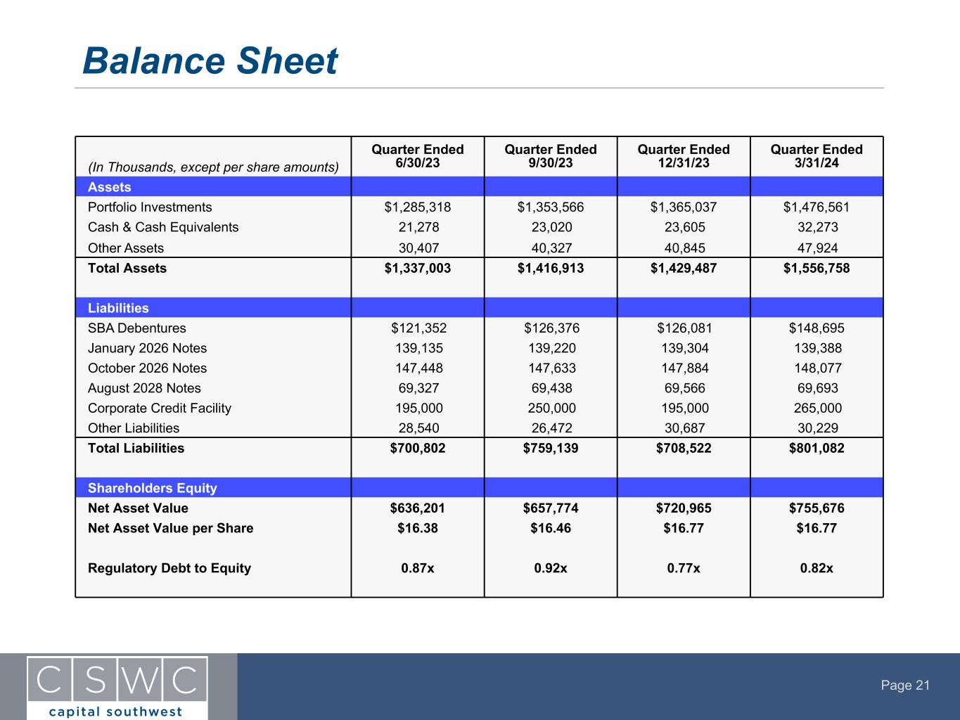 Page 21 Balance Sheet (In Thousands, except per share amounts) Quarter Ended 6/30/23 Quarter Ended 9/30/23 Quarter Ended 12/31/23 Quarter Ended 3/31/24 Assets Portfolio Investments $1,285,318 $1,353,566 $1,365,037 $1,476,561 Cash & Cash Equivalents 21,278 23,020 23,605 32,273 Other Assets 30,407 40,327 40,845 47,924 Total Assets $1,337,003 $1,416,913 $1,429,487 $1,556,758 Liabilities SBA Debentures $121,352 $126,376 $126,081 $148,695 January 2026 Notes 139,135 139,220 139,304 139,388 October 2026 Notes 147,448 147,633 147,884 148,077 August 2028 Notes 69,327 69,438 69,566 69,693 Corporate Credit Facility 195,000 250,000 195,000 265,000 Other Liabilities 28,540 26,472 30,687 30,229 Total Liabilities $700,802 $759,139 $708,522 $801,082 Shareholders Equity Net Asset Value $636,201 $657,774 $720,965 $755,676 Net Asset Value per Share $16.38 $16.46 $16.77 $16.77 Regulatory Debt to Equity 0.87x 0.92x 0.77x 0.82x