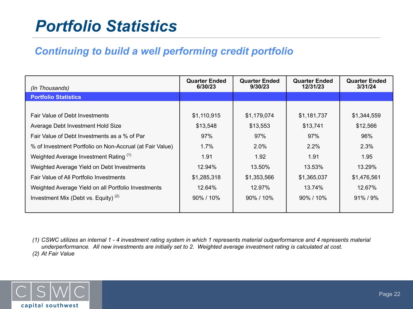 Page 22 Portfolio Statistics (1) CSWC utilizes an internal 1 - 4 investment rating system in which 1 represents material outperformance and 4 represents material underperformance. All new investments are initially set to 2. Weighted average investment rating is calculated at cost. (2) At Fair Value Continuing to build a well performing credit portfolio (In Thousands) Quarter Ended 6/30/23 Quarter Ended 9/30/23 Quarter Ended 12/31/23 Quarter Ended 3/31/24 Portfolio Statistics Fair Value of Debt Investments $1,110,915 $1,179,074 $1,181,737 $1,344,559 Average Debt Investment Hold Size $13,548 $13,553 $13,741 $12,566 Fair Value of Debt Investments as a % of Par 97% 97% 97% 96% % of Investment Portfolio on Non-Accrual (at Fair Value) 1.7% 2.0% 2.2% 2.3% Weighted Average Investment Rating (1) 1.91 1.92 1.91 1.95 Weighted Average Yield on Debt Investments 12.94% 13.50% 13.53% 13.29% Fair Value of All Portfolio Investments $1,285,318 $1,353,566 $1,365,037 $1,476,561 Weighted Average Yield on all Portfolio Investments 12.64% 12.97% 13.74% 12.67% Investment Mix (Debt vs. Equity) (2) 90% / 10% 90% / 10% 90% / 10% 91% / 9%