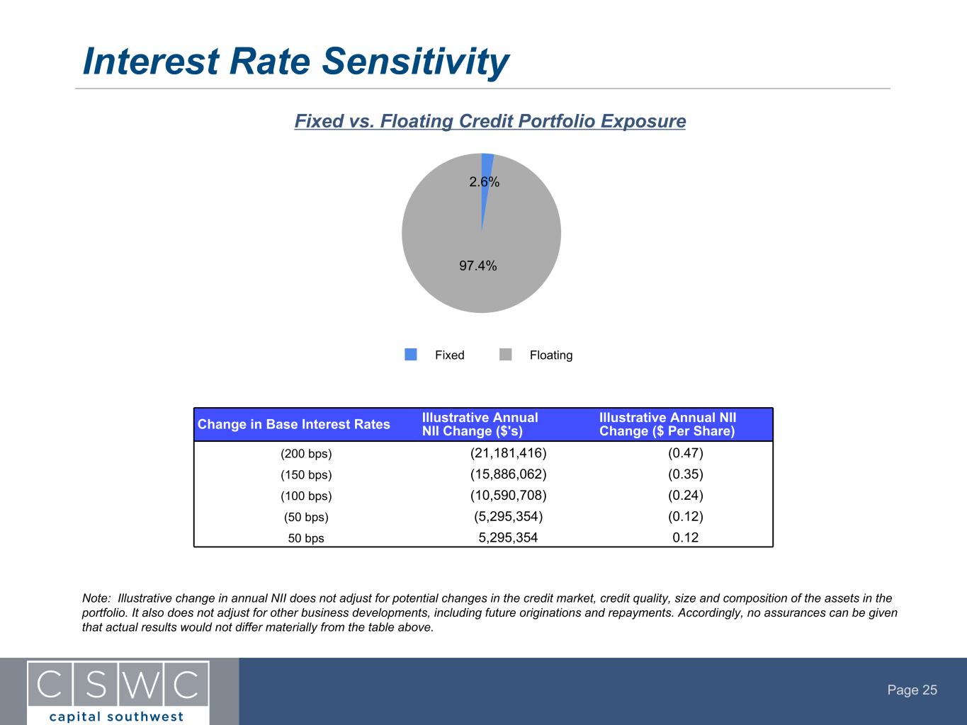 Page 25 Note: Illustrative change in annual NII does not adjust for potential changes in the credit market, credit quality, size and composition of the assets in the portfolio. It also does not adjust for other business developments, including future originations and repayments. Accordingly, no assurances can be given that actual results would not differ materially from the table above. Interest Rate Sensitivity Fixed vs. Floating Credit Portfolio Exposure Change in Base Interest Rates Illustrative Annual NII Change ($'s) Illustrative Annual NII Change ($ Per Share) (200 bps) (21,181,416) (0.47) (150 bps) (15,886,062) (0.35) (100 bps) (10,590,708) (0.24) (50 bps) (5,295,354) (0.12) 50 bps 5,295,354 0.12 2.6% 97.4% Fixed Floating