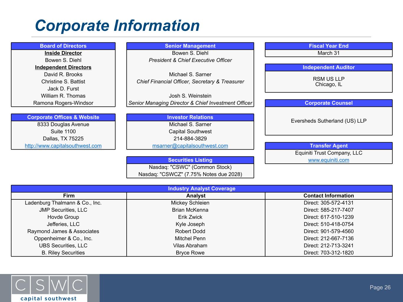 Page 26 Corporate Information Board of Directors Senior Management Fiscal Year End Inside Director Bowen S. Diehl March 31 Bowen S. Diehl President & Chief Executive Officer Independent Directors Independent Auditor David R. Brooks Michael S. Sarner RSM US LLP Chicago, ILChristine S. Battist Chief Financial Officer, Secretary & Treasurer Jack D. Furst William R. Thomas Josh S. Weinstein Ramona Rogers-Windsor Senior Managing Director & Chief Investment Officer Corporate Counsel Eversheds Sutherland (US) LLP Corporate Offices & Website Investor Relations 8333 Douglas Avenue Michael S. Sarner Suite 1100 Capital Southwest Dallas, TX 75225 214-884-3829 http://www.capitalsouthwest.com msarner@capitalsouthwest.com Transfer Agent Equiniti Trust Company, LLC Securities Listing www.equiniti.com Nasdaq: "CSWC" (Common Stock) Nasdaq: "CSWCZ" (7.75% Notes due 2028) Industry Analyst Coverage Firm Analyst Contact Information Ladenburg Thalmann & Co., Inc. Mickey Schleien Direct: 305-572-4131 JMP Securities, LLC Brian McKenna Direct: 585-217-7407 Hovde Group Erik Zwick Direct: 617-510-1239 Jefferies, LLC Kyle Joseph Direct: 510-418-0754 Raymond James & Associates Robert Dodd Direct: 901-579-4560 Oppenheimer & Co., Inc. Mitchel Penn Direct: 212-667-7136 UBS Securities, LLC Vilas Abraham Direct: 212-713-3241 B. Riley Securities Bryce Rowe Direct: 703-312-1820