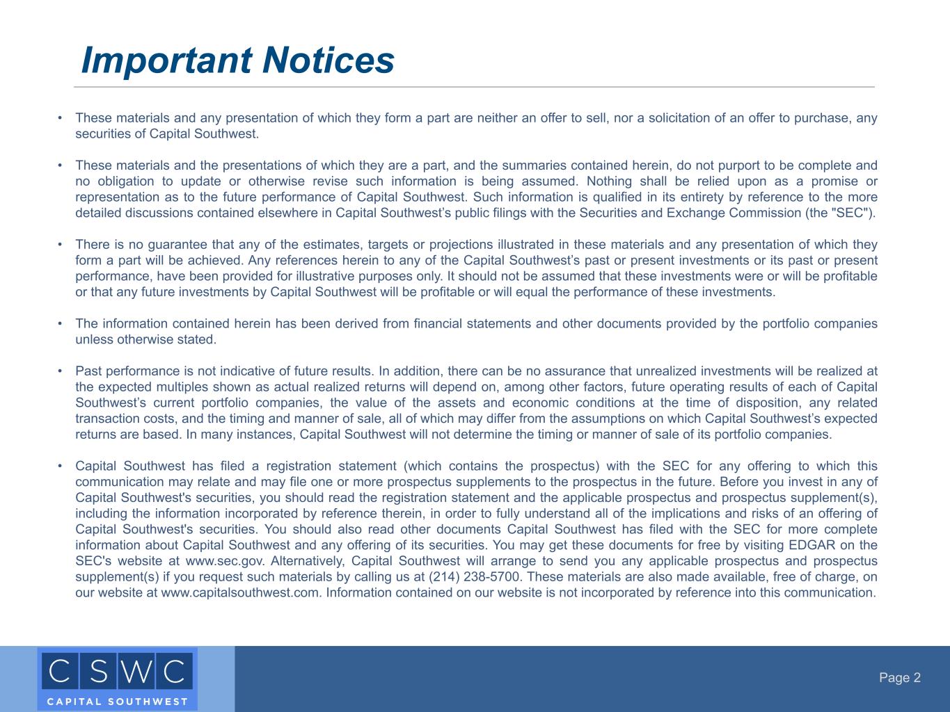 Page 2 Important Notices • These materials and any presentation of which they form a part are neither an offer to sell, nor a solicitation of an offer to purchase, any securities of Capital Southwest. • These materials and the presentations of which they are a part, and the summaries contained herein, do not purport to be complete and no obligation to update or otherwise revise such information is being assumed. Nothing shall be relied upon as a promise or representation as to the future performance of Capital Southwest. Such information is qualified in its entirety by reference to the more detailed discussions contained elsewhere in Capital Southwest’s public filings with the Securities and Exchange Commission (the "SEC"). • There is no guarantee that any of the estimates, targets or projections illustrated in these materials and any presentation of which they form a part will be achieved. Any references herein to any of the Capital Southwest’s past or present investments or its past or present performance, have been provided for illustrative purposes only. It should not be assumed that these investments were or will be profitable or that any future investments by Capital Southwest will be profitable or will equal the performance of these investments. • The information contained herein has been derived from financial statements and other documents provided by the portfolio companies unless otherwise stated. • Past performance is not indicative of future results. In addition, there can be no assurance that unrealized investments will be realized at the expected multiples shown as actual realized returns will depend on, among other factors, future operating results of each of Capital Southwest’s current portfolio companies, the value of the assets and economic conditions at the time of disposition, any related transaction costs, and the timing and manner of sale, all of which may differ from the assumptions on which Capital Southwest’s expected returns are based. In many instances, Capital Southwest will not determine the timing or manner of sale of its portfolio companies. • Capital Southwest has filed a registration statement (which contains the prospectus) with the SEC for any offering to which this communication may relate and may file one or more prospectus supplements to the prospectus in the future. Before you invest in any of Capital Southwest's securities, you should read the registration statement and the applicable prospectus and prospectus supplement(s), including the information incorporated by reference therein, in order to fully understand all of the implications and risks of an offering of Capital Southwest's securities. You should also read other documents Capital Southwest has filed with the SEC for more complete information about Capital Southwest and any offering of its securities. You may get these documents for free by visiting EDGAR on the SEC's website at www.sec.gov. Alternatively, Capital Southwest will arrange to send you any applicable prospectus and prospectus supplement(s) if you request such materials by calling us at (214) 238-5700. These materials are also made available, free of charge, on our website at www.capitalsouthwest.com. Information contained on our website is not incorporated by reference into this communication.