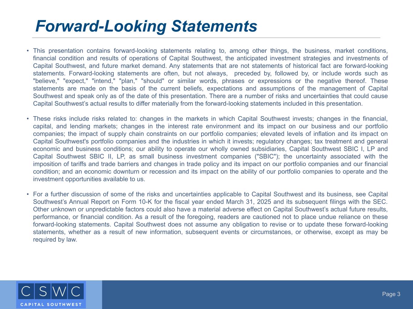 Page 3 • This presentation contains forward-looking statements relating to, among other things, the business, market conditions, financial condition and results of operations of Capital Southwest, the anticipated investment strategies and investments of Capital Southwest, and future market demand. Any statements that are not statements of historical fact are forward-looking statements. Forward-looking statements are often, but not always, preceded by, followed by, or include words such as "believe," "expect," "intend," "plan," "should" or similar words, phrases or expressions or the negative thereof. These statements are made on the basis of the current beliefs, expectations and assumptions of the management of Capital Southwest and speak only as of the date of this presentation. There are a number of risks and uncertainties that could cause Capital Southwest’s actual results to differ materially from the forward-looking statements included in this presentation. • These risks include risks related to: changes in the markets in which Capital Southwest invests; changes in the financial, capital, and lending markets; changes in the interest rate environment and its impact on our business and our portfolio companies; the impact of supply chain constraints on our portfolio companies; elevated levels of inflation and its impact on Capital Southwest's portfolio companies and the industries in which it invests; regulatory changes; tax treatment and general economic and business conditions; our ability to operate our wholly owned subsidiaries, Capital Southwest SBIC I, LP and Capital Southwest SBIC II, LP, as small business investment companies ("SBIC"); the uncertainty associated with the imposition of tariffs and trade barriers and changes in trade policy and its impact on our portfolio companies and our financial condition; and an economic downturn or recession and its impact on the ability of our portfolio companies to operate and the investment opportunities available to us. • For a further discussion of some of the risks and uncertainties applicable to Capital Southwest and its business, see Capital Southwest’s Annual Report on Form 10-K for the fiscal year ended March 31, 2025 and its subsequent filings with the SEC. Other unknown or unpredictable factors could also have a material adverse effect on Capital Southwest’s actual future results, performance, or financial condition. As a result of the foregoing, readers are cautioned not to place undue reliance on these forward-looking statements. Capital Southwest does not assume any obligation to revise or to update these forward-looking statements, whether as a result of new information, subsequent events or circumstances, or otherwise, except as may be required by law. Forward-Looking Statements
