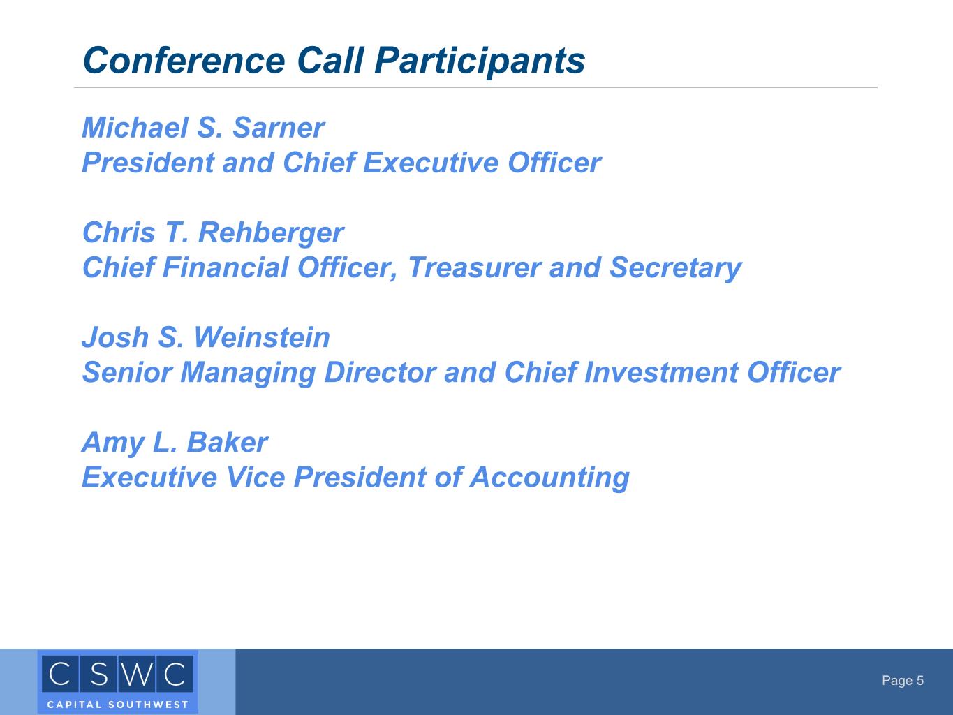 Page 5 Michael S. Sarner President and Chief Executive Officer Chris T. Rehberger Chief Financial Officer, Treasurer and Secretary Josh S. Weinstein Senior Managing Director and Chief Investment Officer Amy L. Baker Executive Vice President of Accounting Conference Call Participants
