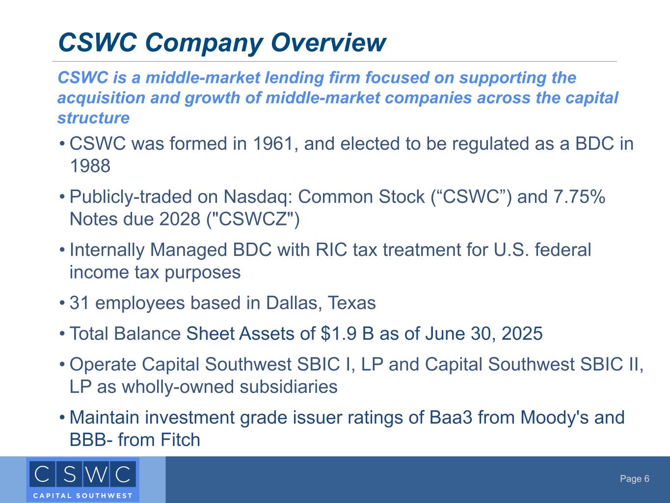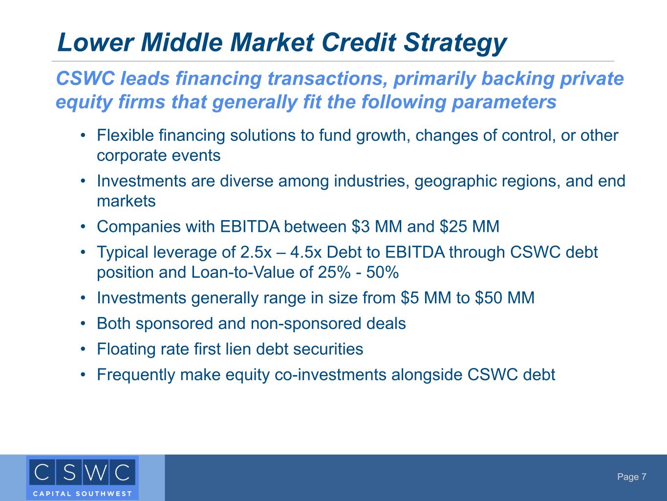 Page 6 • CSWC was formed in 1961, and elected to be regulated as a BDC in 1988 • Publicly-traded on Nasdaq: Common Stock (“CSWC”) and 7.75% Notes due 2028 ("CSWCZ") • Internally Managed BDC with RIC tax treatment for U.S. federal income tax purposes • 31 employees based in Dallas, Texas • Total Balance Sheet Assets of $1.9 B as of June 30, 2025 • Operate Capital Southwest SBIC I, LP and Capital Southwest SBIC II, LP as wholly-owned subsidiaries • Maintain investment grade issuer ratings of Baa3 from Moody's and BBB- from Fitch CSWC Company Overview CSWC is a middle-market lending firm focused on supporting the acquisition and growth of middle-market companies across the capital structure