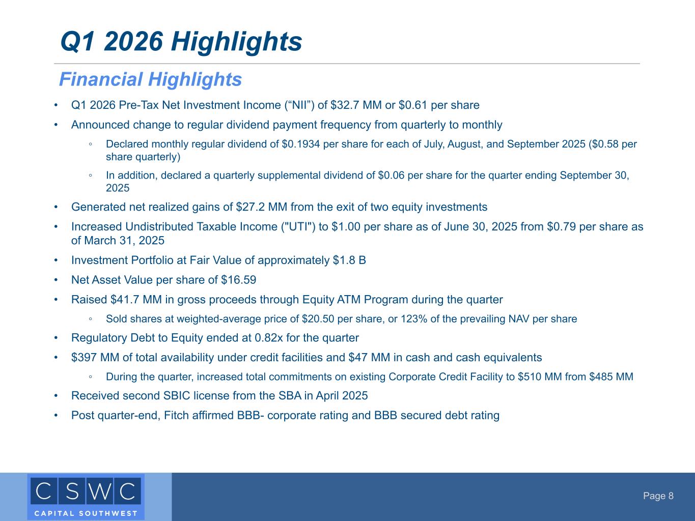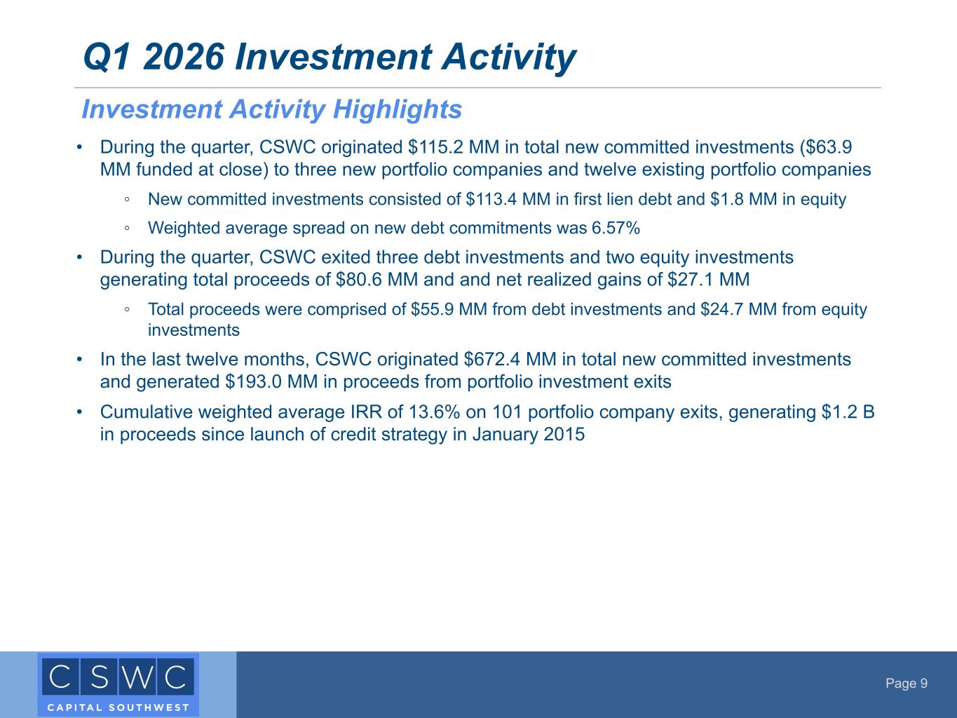 Page 8 • Q1 2026 Pre-Tax Net Investment Income (“NII”) of $32.7 MM or $0.61 per share • Announced change to regular dividend payment frequency from quarterly to monthly ◦ Declared monthly regular dividend of $0.1934 per share for each of July, August, and September 2025 ($0.58 per share quarterly) ◦ In addition, declared a quarterly supplemental dividend of $0.06 per share for the quarter ending September 30, 2025 • Generated net realized gains of $27.2 MM from the exit of two equity investments • Increased Undistributed Taxable Income ("UTI") to $1.00 per share as of June 30, 2025 from $0.79 per share as of March 31, 2025 • Investment Portfolio at Fair Value of approximately $1.8 B • Net Asset Value per share of $16.59 • Raised $41.7 MM in gross proceeds through Equity ATM Program during the quarter ◦ Sold shares at weighted-average price of $20.50 per share, or 123% of the prevailing NAV per share • Regulatory Debt to Equity ended at 0.82x for the quarter • $397 MM of total availability under credit facilities and $47 MM in cash and cash equivalents ◦ During the quarter, increased total commitments on existing Corporate Credit Facility to $510 MM from $485 MM • Received second SBIC license from the SBA in April 2025 • Post quarter-end, Fitch affirmed BBB- corporate rating and BBB secured debt rating Q1 2026 Highlights Financial Highlights