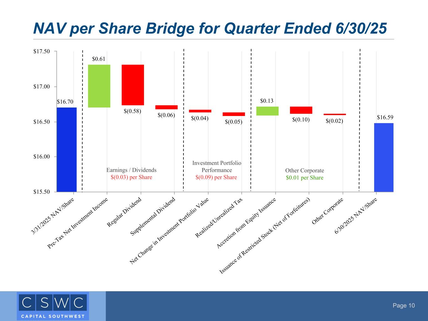 Page 10 $16.70 $0.61 $(0.58) $(0.06) $(0.04) $(0.05) $0.13 $(0.10) $(0.02) $16.59 3/31/2025 NAV/Share Pre- Tax Net I nvest ment In come Regular Dividend Supplem ental Dividend Net C hange in In vest ment P ortfo lio Valu e Real ize d/Unrea lize d Tax Accr etio n fro m Equity Iss uance Iss uance of R est ric ted Stock (N et o f F orfe itu res ) Other Corporat e 6/30/2025 NAV/Share $15.50 $16.00 $16.50 $17.00 $17.50 NAV per Share Bridge for Quarter Ended 6/30/25 Earnings / Dividends $(0.03) per Share Investment Portfolio Performance $(0.09) per Share Other Corporate $0.01 per Share