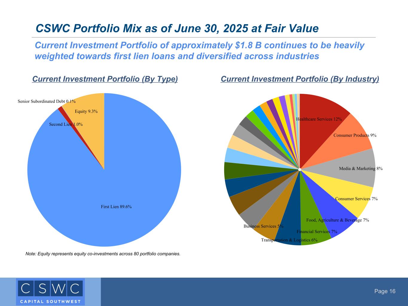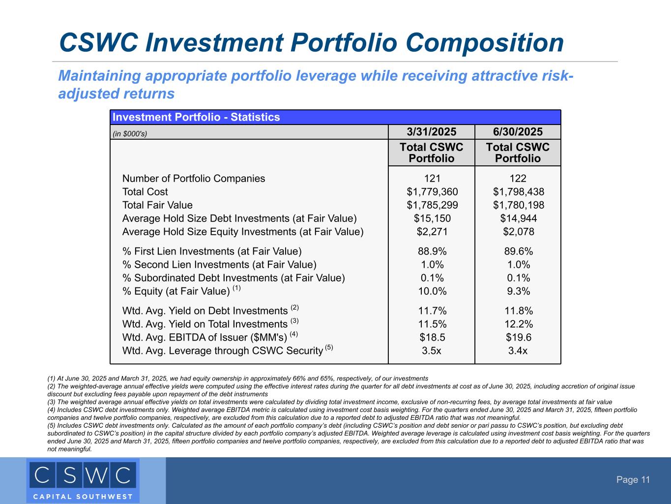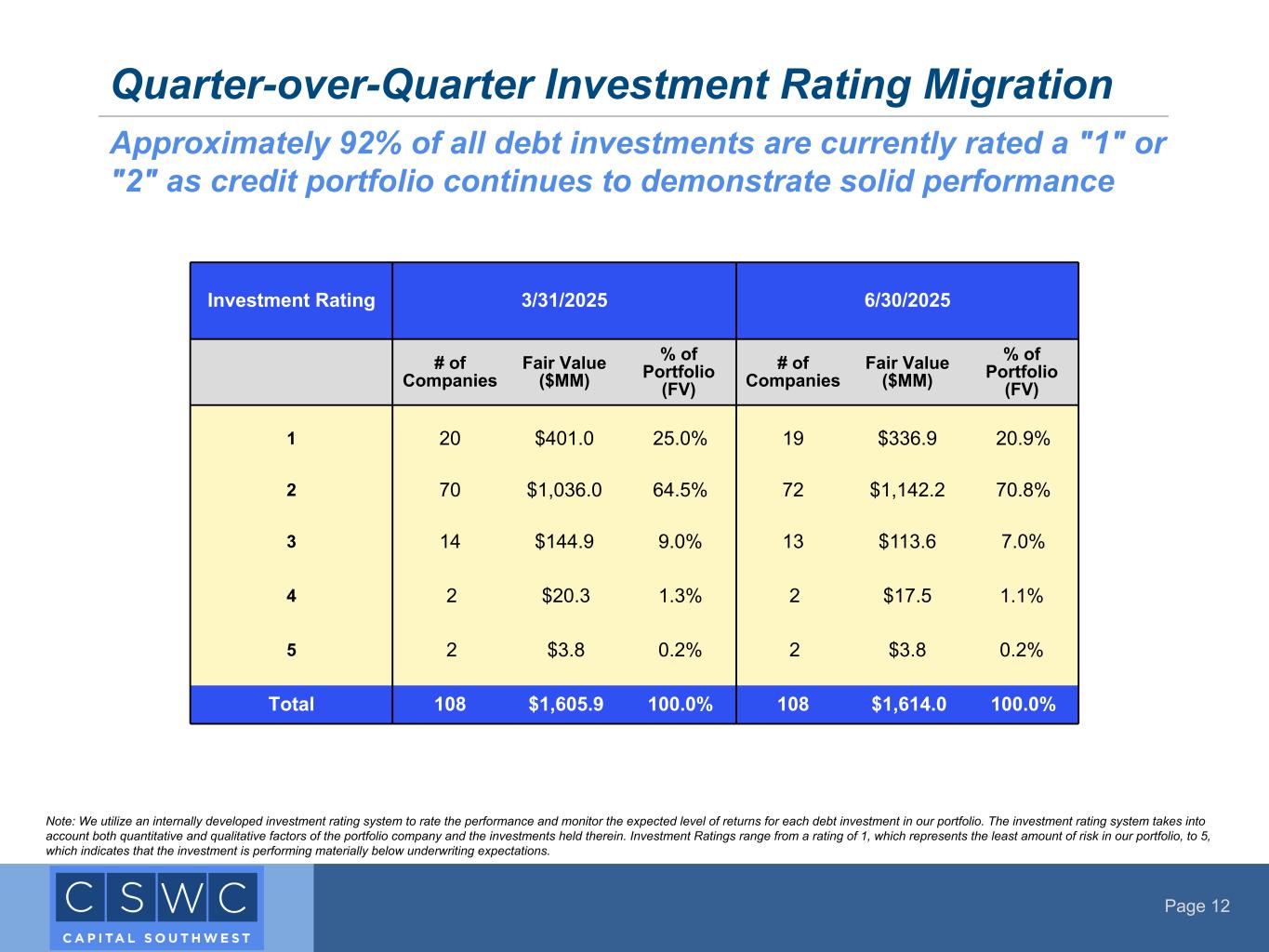 Page 11 CSWC Investment Portfolio Composition (1) At June 30, 2025 and March 31, 2025, we had equity ownership in approximately 66% and 65%, respectively, of our investments (2) The weighted-average annual effective yields were computed using the effective interest rates during the quarter for all debt investments at cost as of June 30, 2025, including accretion of original issue discount but excluding fees payable upon repayment of the debt instruments (3) The weighted average annual effective yields on total investments were calculated by dividing total investment income, exclusive of non-recurring fees, by average total investments at fair value (4) Includes CSWC debt investments only. Weighted average EBITDA metric is calculated using investment cost basis weighting. For the quarters ended June 30, 2025 and March 31, 2025, fifteen portfolio companies and twelve portfolio companies, respectively, are excluded from this calculation due to a reported debt to adjusted EBITDA ratio that was not meaningful. (5) Includes CSWC debt investments only. Calculated as the amount of each portfolio company’s debt (including CSWC’s position and debt senior or pari passu to CSWC’s position, but excluding debt subordinated to CSWC’s position) in the capital structure divided by each portfolio company’s adjusted EBITDA. Weighted average leverage is calculated using investment cost basis weighting. For the quarters ended June 30, 2025 and March 31, 2025, fifteen portfolio companies and twelve portfolio companies, respectively, are excluded from this calculation due to a reported debt to adjusted EBITDA ratio that was not meaningful. Maintaining appropriate portfolio leverage while receiving attractive risk- adjusted returns Investment Portfolio - Statistics (in $000's) 3/31/2025 6/30/2025 Total CSWC Portfolio Total CSWC Portfolio Number of Portfolio Companies 121 122 Total Cost $1,779,360 $1,798,438 Total Fair Value $1,785,299 $1,780,198 Average Hold Size Debt Investments (at Fair Value) $15,150 $14,944 Average Hold Size Equity Investments (at Fair Value) $2,271 $2,078 % First Lien Investments (at Fair Value) 88.9% 89.6% % Second Lien Investments (at Fair Value) 1.0% 1.0% % Subordinated Debt Investments (at Fair Value) 0.1% 0.1% % Equity (at Fair Value) (1) 10.0% 9.3% Wtd. Avg. Yield on Debt Investments (2) 11.7% 11.8% Wtd. Avg. Yield on Total Investments (3) 11.5% 12.2% Wtd. Avg. EBITDA of Issuer ($MM's) (4) $18.5 $19.6 Wtd. Avg. Leverage through CSWC Security (5) 3.5x 3.4x