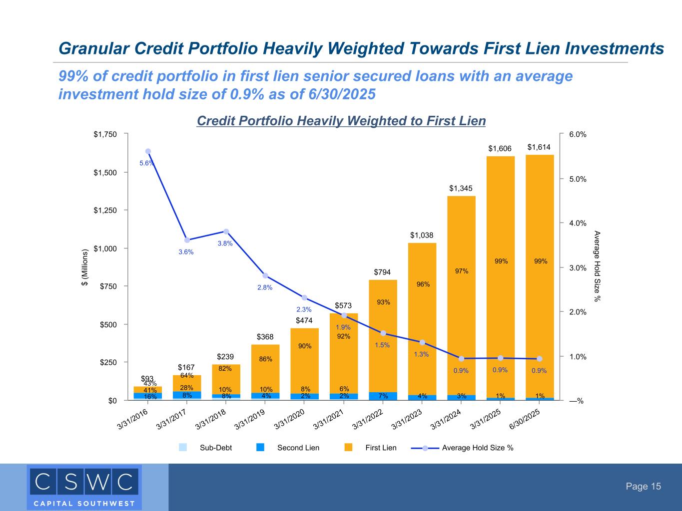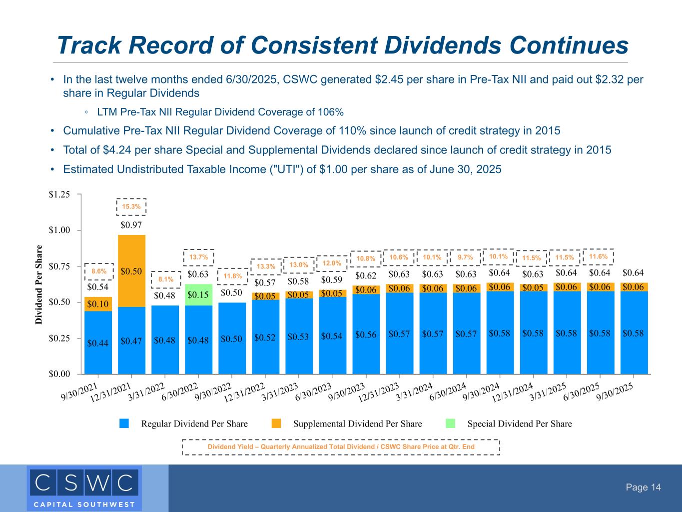 Page 14 • In the last twelve months ended 6/30/2025, CSWC generated $2.45 per share in Pre-Tax NII and paid out $2.32 per share in Regular Dividends ◦ LTM Pre-Tax NII Regular Dividend Coverage of 106% • Cumulative Pre-Tax NII Regular Dividend Coverage of 110% since launch of credit strategy in 2015 • Total of $4.24 per share Special and Supplemental Dividends declared since launch of credit strategy in 2015 • Estimated Undistributed Taxable Income ("UTI") of $1.00 per share as of June 30, 2025 Track Record of Consistent Dividends Continues Dividend Yield – Quarterly Annualized Total Dividend / CSWC Share Price at Qtr. End D iv id en d Pe r Sh ar e $0.54 $0.97 $0.48 $0.63 $0.50 $0.57 $0.58 $0.59 $0.62 $0.63 $0.63 $0.63 $0.64 $0.63 $0.64 $0.64 $0.64 $0.44 $0.47 $0.48 $0.48 $0.50 $0.52 $0.53 $0.54 $0.56 $0.57 $0.57 $0.57 $0.58 $0.58 $0.58 $0.58 $0.58 $0.10 $0.50 $0.05 $0.05 $0.05 $0.06 $0.06 $0.06 $0.06 $0.06 $0.05 $0.06 $0.06 $0.06 $0.15 Regular Dividend Per Share Supplemental Dividend Per Share Special Dividend Per Share 9/30/2021 12/31/2021 3/31/2022 6/30/2022 9/30/2022 12/31/2022 3/31/2023 6/30/2023 9/30/2023 12/31/2023 3/31/2024 6/30/2024 9/30/2024 12/31/2024 3/31/2025 6/30/2025 9/30/2025 $0.00 $0.25 $0.50 $0.75 $1.00 $1.25 8.6% 15.3% 8.1% 13.7% 13.3% 13.0% 11.8% 12.0% 10.8% 10.6% 10.1% 9.7% 10.1% 11.5% 11.5% 11.6%