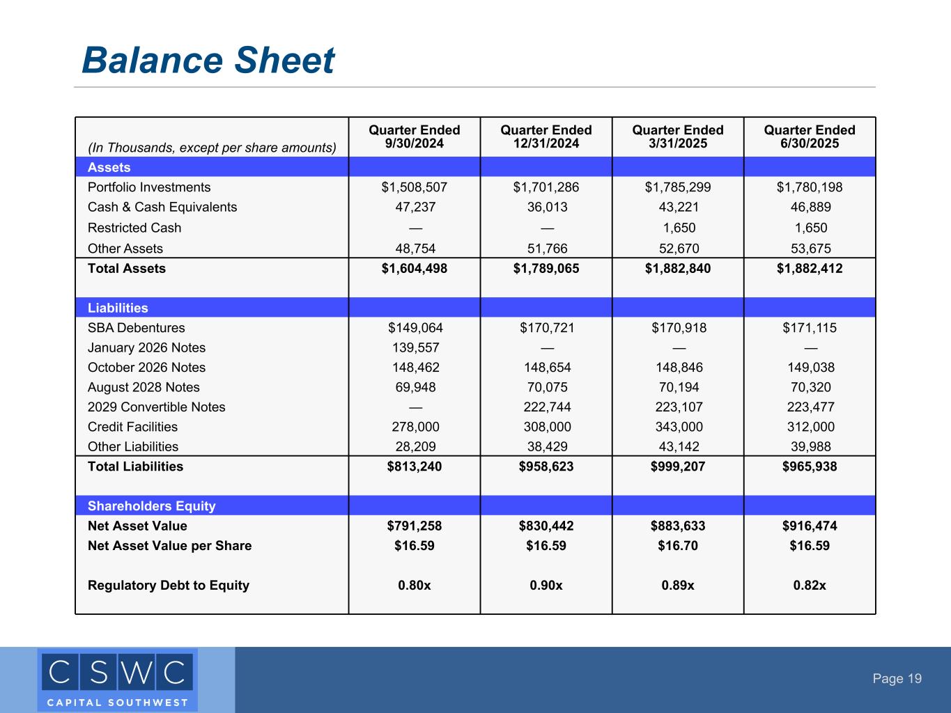 Page 19 Balance Sheet (In Thousands, except per share amounts) Quarter Ended 9/30/2024 Quarter Ended 12/31/2024 Quarter Ended 3/31/2025 Quarter Ended 6/30/2025 Assets Portfolio Investments $1,508,507 $1,701,286 $1,785,299 $1,780,198 Cash & Cash Equivalents 47,237 36,013 43,221 46,889 Restricted Cash — — 1,650 1,650 Other Assets 48,754 51,766 52,670 53,675 Total Assets $1,604,498 $1,789,065 $1,882,840 $1,882,412 Liabilities SBA Debentures $149,064 $170,721 $170,918 $171,115 January 2026 Notes 139,557 — — — October 2026 Notes 148,462 148,654 148,846 149,038 August 2028 Notes 69,948 70,075 70,194 70,320 2029 Convertible Notes — 222,744 223,107 223,477 Credit Facilities 278,000 308,000 343,000 312,000 Other Liabilities 28,209 38,429 43,142 39,988 Total Liabilities $813,240 $958,623 $999,207 $965,938 Shareholders Equity Net Asset Value $791,258 $830,442 $883,633 $916,474 Net Asset Value per Share $16.59 $16.59 $16.70 $16.59 Regulatory Debt to Equity 0.80x 0.90x 0.89x 0.82x