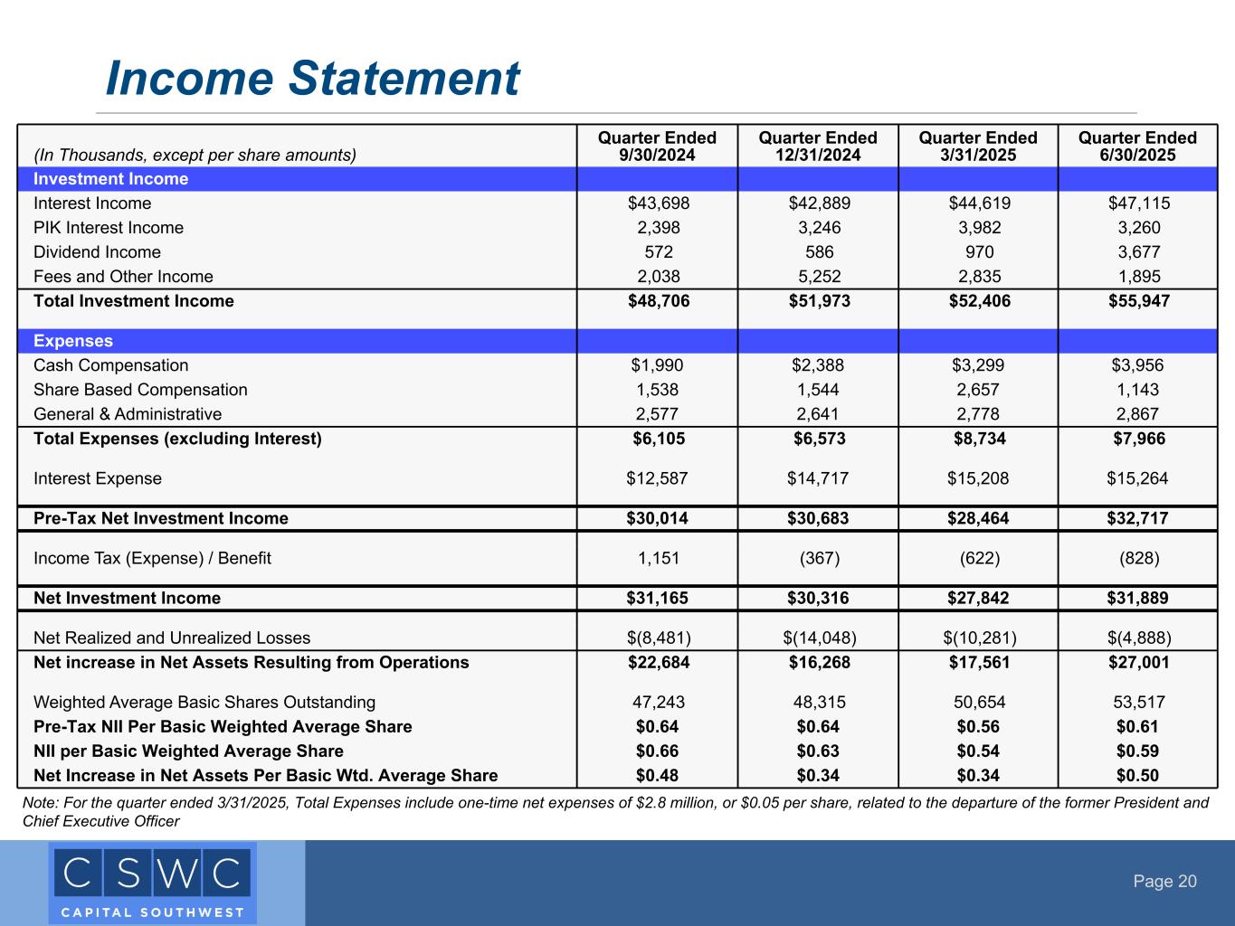Page 20 Income Statement (In Thousands, except per share amounts) Quarter Ended 9/30/2024 Quarter Ended 12/31/2024 Quarter Ended 3/31/2025 Quarter Ended 6/30/2025 Investment Income Interest Income $43,698 $42,889 $44,619 $47,115 PIK Interest Income 2,398 3,246 3,982 3,260 Dividend Income 572 586 970 3,677 Fees and Other Income 2,038 5,252 2,835 1,895 Total Investment Income $48,706 $51,973 $52,406 $55,947 Expenses Cash Compensation $1,990 $2,388 $3,299 $3,956 Share Based Compensation 1,538 1,544 2,657 1,143 General & Administrative 2,577 2,641 2,778 2,867 Total Expenses (excluding Interest) $6,105 $6,573 $8,734 $7,966 Interest Expense $12,587 $14,717 $15,208 $15,264 Pre-Tax Net Investment Income $30,014 $30,683 $28,464 $32,717 Income Tax (Expense) / Benefit 1,151 (367) (622) (828) Net Investment Income $31,165 $30,316 $27,842 $31,889 Net Realized and Unrealized Losses $(8,481) $(14,048) $(10,281) $(4,888) Net increase in Net Assets Resulting from Operations $22,684 $16,268 $17,561 $27,001 Weighted Average Basic Shares Outstanding 47,243 48,315 50,654 53,517 Pre-Tax NII Per Basic Weighted Average Share $0.64 $0.64 $0.56 $0.61 NII per Basic Weighted Average Share $0.66 $0.63 $0.54 $0.59 Net Increase in Net Assets Per Basic Wtd. Average Share $0.48 $0.34 $0.34 $0.50 Note: For the quarter ended 3/31/2025, Total Expenses include one-time net expenses of $2.8 million, or $0.05 per share, related to the departure of the former President and Chief Executive Officer