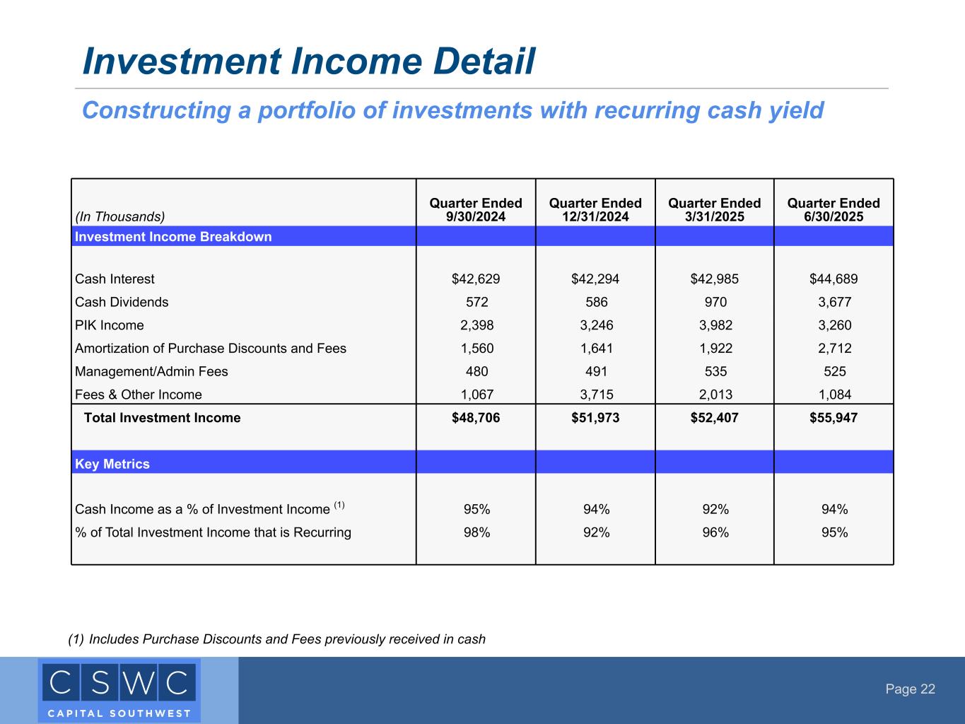 Page 22 Investment Income Detail Constructing a portfolio of investments with recurring cash yield (In Thousands) Quarter Ended 9/30/2024 Quarter Ended 12/31/2024 Quarter Ended 3/31/2025 Quarter Ended 6/30/2025 Investment Income Breakdown Cash Interest $42,629 $42,294 $42,985 $44,689 Cash Dividends 572 586 970 3,677 PIK Income 2,398 3,246 3,982 3,260 Amortization of Purchase Discounts and Fees 1,560 1,641 1,922 2,712 Management/Admin Fees 480 491 535 525 Fees & Other Income 1,067 3,715 2,013 1,084 Total Investment Income $48,706 $51,973 $52,407 $55,947 Key Metrics Cash Income as a % of Investment Income (1) 95% 94% 92% 94% % of Total Investment Income that is Recurring 98% 92% 96% 95% (1) Includes Purchase Discounts and Fees previously received in cash