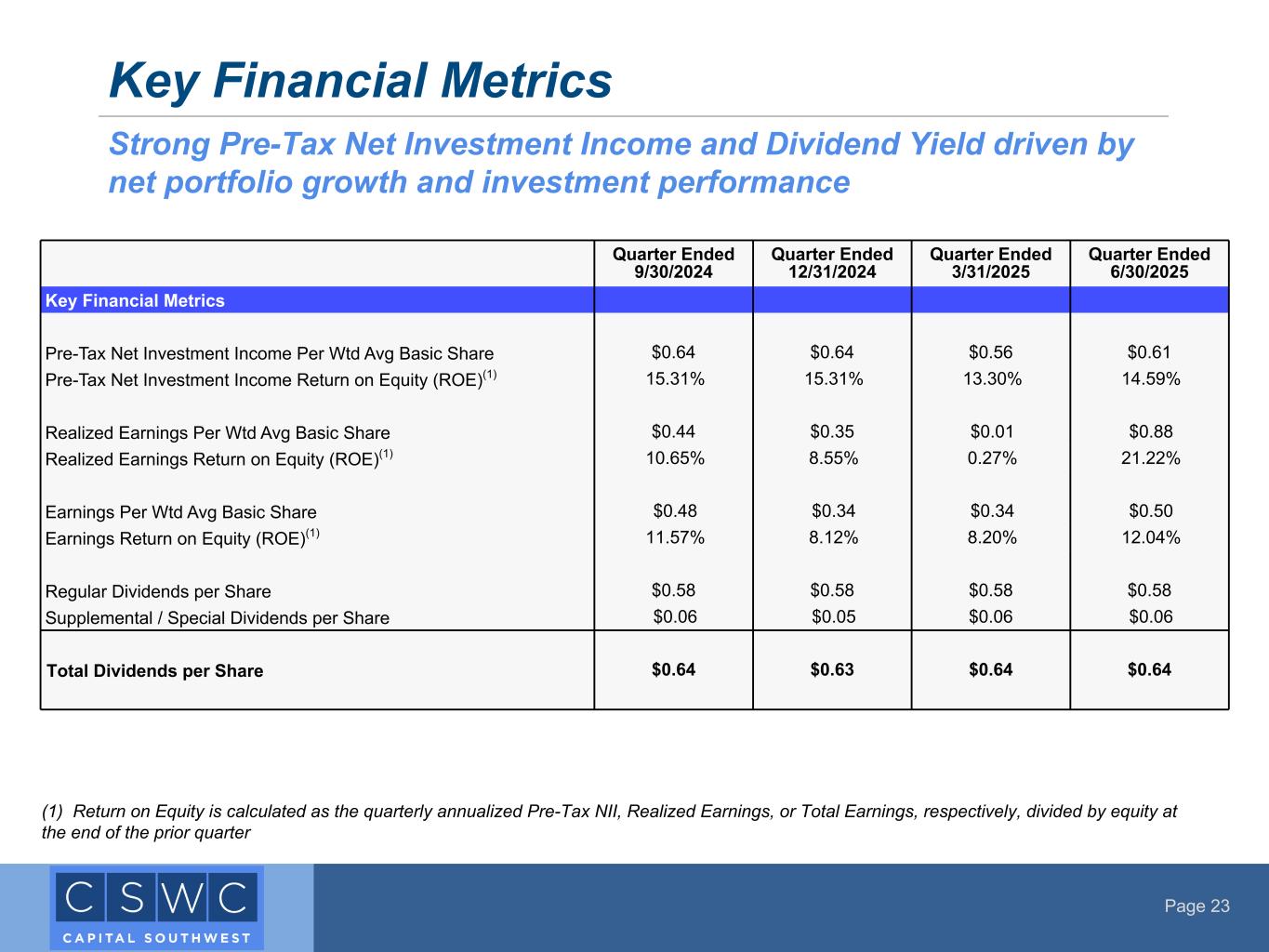 Page 23 Key Financial Metrics Strong Pre-Tax Net Investment Income and Dividend Yield driven by net portfolio growth and investment performance (1) Return on Equity is calculated as the quarterly annualized Pre-Tax NII, Realized Earnings, or Total Earnings, respectively, divided by equity at the end of the prior quarter Quarter Ended 9/30/2024 Quarter Ended 12/31/2024 Quarter Ended 3/31/2025 Quarter Ended 6/30/2025 Key Financial Metrics Pre-Tax Net Investment Income Per Wtd Avg Basic Share $0.64 $0.64 $0.56 $0.61 Pre-Tax Net Investment Income Return on Equity (ROE)(1) 15.31% 15.31% 13.30% 14.59% Realized Earnings Per Wtd Avg Basic Share $0.44 $0.35 $0.01 $0.88 Realized Earnings Return on Equity (ROE)(1) 10.65% 8.55% 0.27% 21.22% Earnings Per Wtd Avg Basic Share $0.48 $0.34 $0.34 $0.50 Earnings Return on Equity (ROE)(1) 11.57% 8.12% 8.20% 12.04% Regular Dividends per Share $0.58 $0.58 $0.58 $0.58 Supplemental / Special Dividends per Share $0.06 $0.05 $0.06 $0.06 Total Dividends per Share $0.64 $0.63 $0.64 $0.64