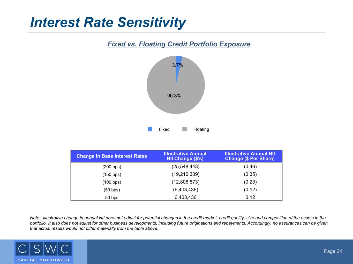 Page 24 Note: Illustrative change in annual NII does not adjust for potential changes in the credit market, credit quality, size and composition of the assets in the portfolio. It also does not adjust for other business developments, including future originations and repayments. Accordingly, no assurances can be given that actual results would not differ materially from the table above. Interest Rate Sensitivity Fixed vs. Floating Credit Portfolio Exposure Change in Base Interest Rates Illustrative Annual NII Change ($'s) Illustrative Annual NII Change ($ Per Share) (200 bps) (25,548,443) (0.46) (150 bps) (19,210,309) (0.35) (100 bps) (12,806,873) (0.23) (50 bps) (6,403,436) (0.12) 50 bps 6,403,436 0.12 3.7% 96.3% Fixed Floating