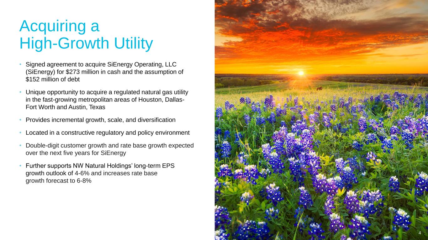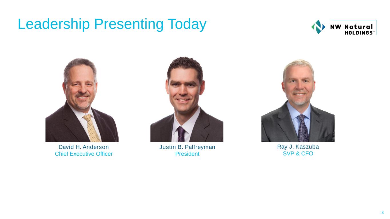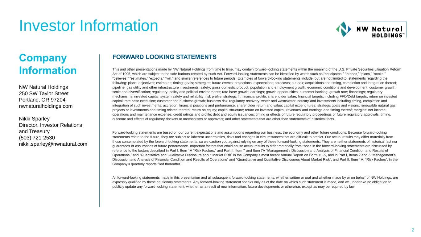 Investor Information Company Information NW Natural Holdings 250 SW Taylor Street Portland, OR 97204 nwnaturalholdings.com Nikki Sparley Director, Investor Relations and Treasury (503) 721-2530 nikki.sparley@nwnatural.com FORWARD LOOKING STATEMENTS This and other presentations made by NW Natural Holdings from time to time, may contain forward-looking statements within the meaning of the U.S. Private Securities Litigation Reform Act of 1995, which are subject to the safe harbors created by such Act. Forward-looking statements can be identified by words such as “anticipates,” “intends,” “plans,” “seeks,” “believes,” “estimates,” “expects,” “will,” and similar references to future periods. Examples of forward-looking statements include, but are not limited to, statements regarding the following: plans; objectives; estimates; timing; goals; strategies; future events; projections; expectations; forecasts; outlook; acquisitions and timing, completion and integration thereof; pipeline, gas utility and other infrastructure investments; safety; gross domestic product, population and employment growth; economic conditions and development; customer growth; scale and diversification; regulatory, policy and political environments; rate base growth; earnings; growth opportunities; customer backlog; growth rate; financings; regulatory mechanisms; invested capital; system safety and reliability; risk profile; strategic fit; financial profile; shareholder value; financial targets, including FFO/Debt targets; return on invested capital; rate case execution; customer and business growth; business risk; regulatory recovery; water and wastewater industry and investments including timing, completion and integration of such investments; accretion, financial positions and performance; shareholder return and value; capital expenditures; strategic goals and visions; renewable natural gas projects or investments and timing related thereto; return on equity; capital structure; return on invested capital; revenues and earnings and timing thereof; margins; net income; operations and maintenance expense; credit ratings and profile; debt and equity issuances; timing or effects of future regulatory proceedings or future regulatory approvals; timing, outcome and effects of regulatory dockets or mechanisms or approvals; and other statements that are other than statements of historical facts. Forward-looking statements are based on our current expectations and assumptions regarding our business, the economy and other future conditions. Because forward-looking statements relate to the future, they are subject to inherent uncertainties, risks and changes in circumstances that are difficult to predict. Our actual results may differ materially from those contemplated by the forward-looking statements, so we caution you against relying on any of these forward-looking statements. They are neither statements of historical fact nor guarantees or assurances of future performance. Important factors that could cause actual results to differ materially from those in the forward-looking statements are discussed by reference to the factors described in Part I, Item 1A “Risk Factors,” and Part II, Item 7 and Item 7A “Management’s Discussion and Analysis of Financial Condition and Results of Operations,” and “Quantitative and Qualitative Disclosure about Market Risk” in the Company’s most recent Annual Report on Form 10-K, and in Part I, Items 2 and 3 “Management’s Discussion and Analysis of Financial Condition and Results of Operations” and “Quantitative and Qualitative Disclosures About Market Risk”, and Part II, Item 1A, “Risk Factors”, in the Company’s quarterly reports filed thereafter. All forward-looking statements made in this presentation and all subsequent forward-looking statements, whether written or oral and whether made by or on behalf of NW Holdings, are expressly qualified by these cautionary statements. Any forward-looking statement speaks only as of the date on which such statement is made, and we undertake no obligation to publicly update any forward-looking statement, whether as a result of new information, future developments or otherwise, except as may be required by law. 2