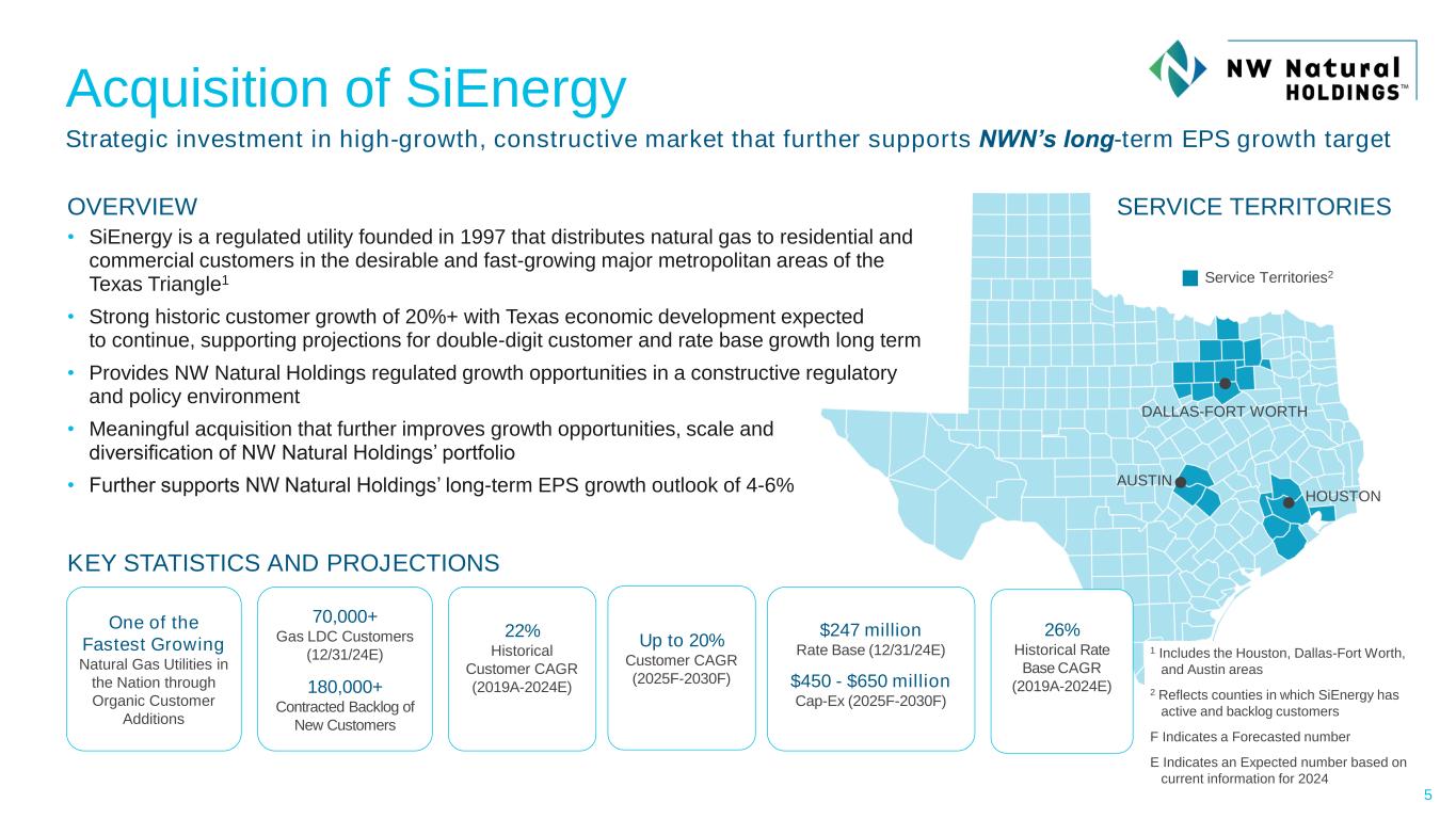 4 • Signed agreement to acquire SiEnergy Operating, LLC (SiEnergy) for $273 million in cash and the assumption of $152 million of debt • Unique opportunity to acquire a regulated natural gas utility in the fast-growing metropolitan areas of Houston, Dallas- Fort Worth and Austin, Texas • Provides incremental growth, scale, and diversification • Located in a constructive regulatory and policy environment • Double-digit customer growth and rate base growth expected over the next five years for SiEnergy • Further supports NW Natural Holdings’ long-term EPS growth outlook of 4-6% and increases rate base growth forecast to 6-8% Acquiring a High-Growth Utility