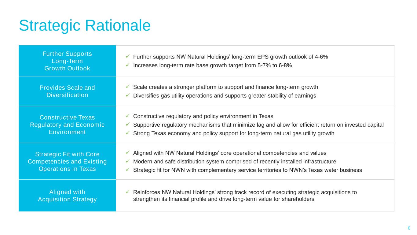OVERVIEW • SiEnergy is a regulated utility founded in 1997 that distributes natural gas to residential and commercial customers in the desirable and fast-growing major metropolitan areas of the Texas Triangle1 • Strong historic customer growth of 20%+ with Texas economic development expected to continue, supporting projections for double-digit customer and rate base growth long term • Provides NW Natural Holdings regulated growth opportunities in a constructive regulatory and policy environment • Meaningful acquisition that further improves growth opportunities, scale and diversification of NW Natural Holdings’ portfolio • Further supports NW Natural Holdings’ long-term EPS growth outlook of 4-6% 5 1 Includes the Houston, Dallas-Fort Worth, and Austin areas 2 Reflects counties in which SiEnergy has active and backlog customers F Indicates a Forecasted number E Indicates an Expected number based on current information for 2024 KEY STATISTICS AND PROJECTIONS 70,000+ Gas LDC Customers (12/31/24E) 180,000+ Contracted Backlog of New Customers $247 million Rate Base (12/31/24E) $450 - $650 million Cap-Ex (2025F-2030F) 22% Historical Customer CAGR (2019A-2024E) One of the Fastest Growing Natural Gas Utilities in the Nation through Organic Customer Additions SERVICE TERRITORIES Acquisition of SiEnergy Strategic investment in high-growth, constructive market that further supports NWN’s long-term EPS growth target 26% Historical Rate Base CAGR (2019A-2024E) Service Territories2 DALLAS-FORT WORTH AUSTIN HOUSTON Up to 20% Customer CAGR (2025F-2030F)