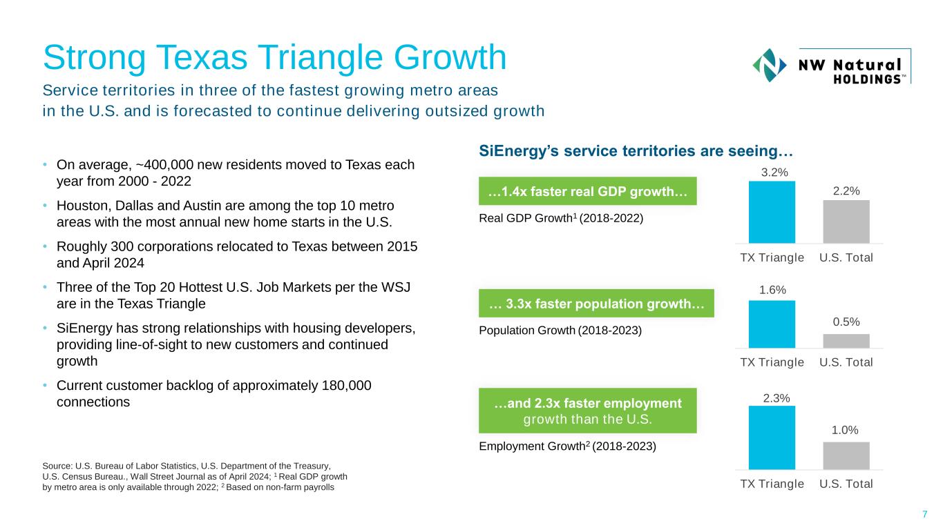 Strategic Rationale Further Supports Long-Term Growth Outlook ✓ Further supports NW Natural Holdings’ long-term EPS growth outlook of 4-6% ✓ Increases long-term rate base growth target from 5-7% to 6-8% Provides Scale and Diversification ✓ Scale creates a stronger platform to support and finance long-term growth ✓ Diversifies gas utility operations and supports greater stability of earnings Constructive Texas Regulatory and Economic Environment ✓ Constructive regulatory and policy environment in Texas ✓ Supportive regulatory mechanisms that minimize lag and allow for efficient return on invested capital ✓ Strong Texas economy and policy support for long-term natural gas utility growth Strategic Fit with Core Competencies and Existing Operations in Texas ✓ Aligned with NW Natural Holdings’ core operational competencies and values ✓ Modern and safe distribution system comprised of recently installed infrastructure ✓ Strategic fit for NWN with complementary service territories to NWN’s Texas water business Aligned with Acquisition Strategy ✓ Reinforces NW Natural Holdings’ strong track record of executing strategic acquisitions to strengthen its financial profile and drive long-term value for shareholders 6