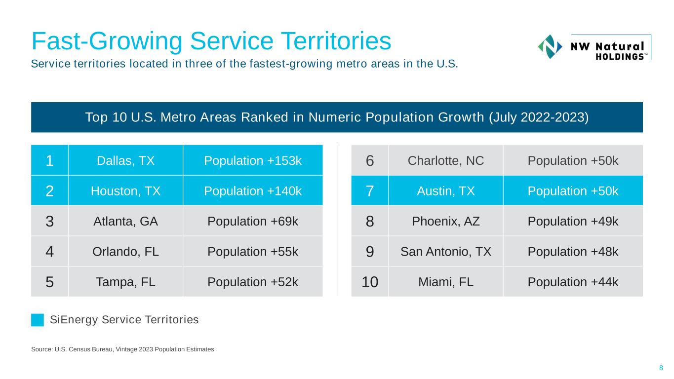 LIQUIDITY OF AND FINANCINGStrong Texas Triangle Growth 7 Service territories in three of the fastest growing metro areas in the U.S. and is forecasted to continue delivering outsized growth • On average, ~400,000 new residents moved to Texas each year from 2000 - 2022 • Houston, Dallas and Austin are among the top 10 metro areas with the most annual new home starts in the U.S. • Roughly 300 corporations relocated to Texas between 2015 and April 2024 • Three of the Top 20 Hottest U.S. Job Markets per the WSJ are in the Texas Triangle • SiEnergy has strong relationships with housing developers, providing line-of-sight to new customers and continued growth • Current customer backlog of approximately 180,000 connections SiEnergy’s service territories are seeing… …1.4x faster real GDP growth… … 3.3x faster population growth… …and 2.3x faster employment growth than the U.S. Real GDP Growth1 (2018-2022) Population Growth (2018-2023) Employment Growth2 (2018-2023) 1.6% 0.5% TX Triangle U.S. Total 2.3% 1.0% TX Triangle U.S. Total Source: U.S. Bureau of Labor Statistics, U.S. Department of the Treasury, U.S. Census Bureau., Wall Street Journal as of April 2024; 1 Real GDP growth by metro area is only available through 2022; 2 Based on non-farm payrolls 3.2% 2.2% TX Triangle U.S. Total