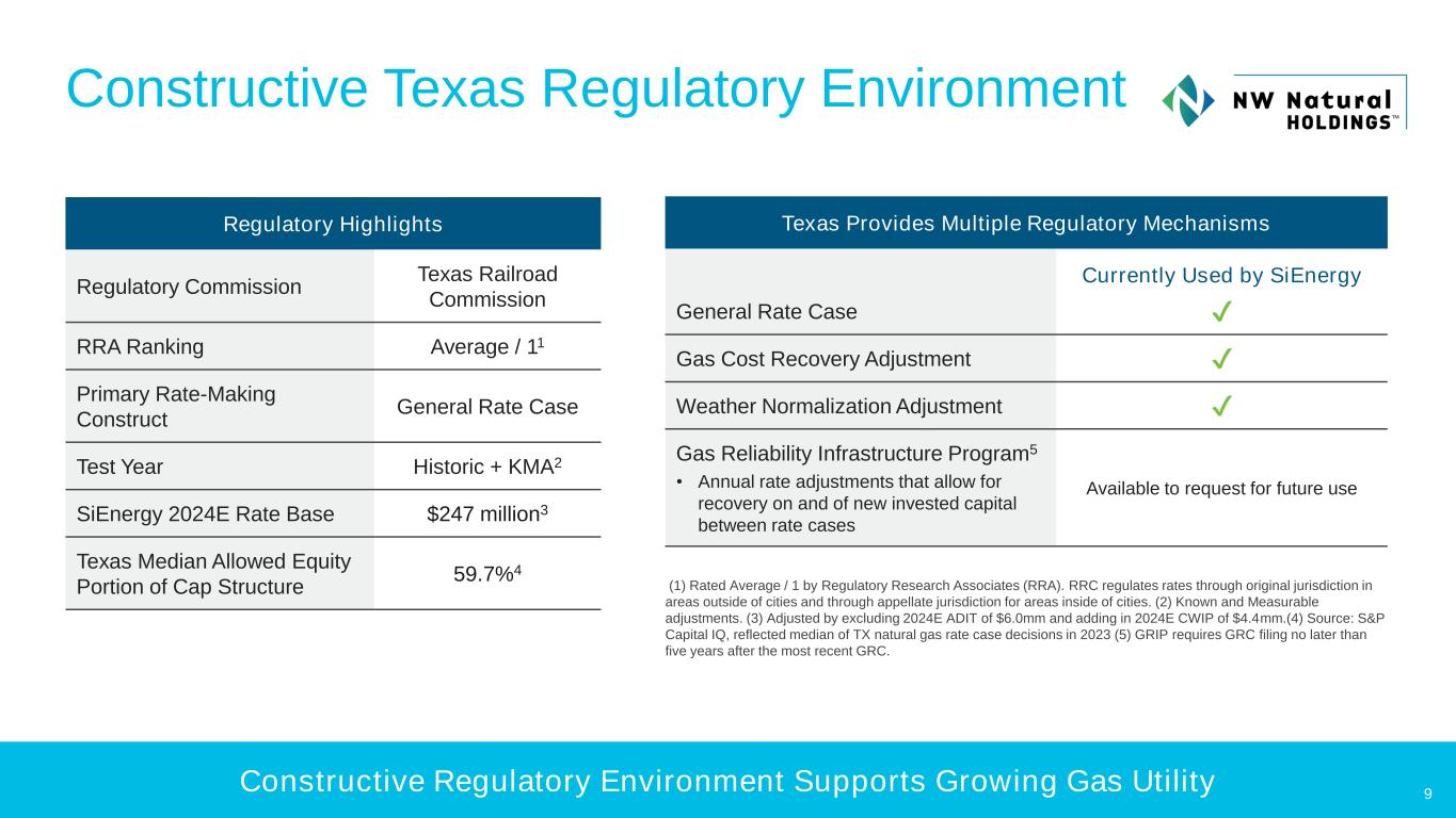 LIQUIDITY OF AND FINANCING Fast-Growing Service Territories 8 Source: U.S. Census Bureau, Vintage 2023 Population Estimates Service territories located in three of the fastest-growing metro areas in the U.S. SiEnergy Service Territories Top 10 U.S. Metro Areas Ranked in Numeric Population Growth (July 2022-2023) 1 Dallas, TX Population +153k 2 Houston, TX Population +140k 3 Atlanta, GA Population +69k 4 Orlando, FL Population +55k 5 Tampa, FL Population +52k 6 Charlotte, NC Population +50k 7 Austin, TX Population +50k 8 Phoenix, AZ Population +49k 9 San Antonio, TX Population +48k 10 Miami, FL Population +44k