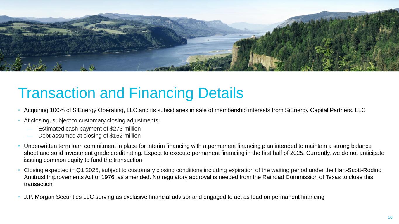 Constructive Regulatory Environment Supports Growing Gas Utility LIQUIDITY OF AND FINANCINGConstructive Texas Regulatory Environment 9 (1) Rated Average / 1 by Regulatory Research Associates (RRA). RRC regulates rates through original jurisdiction in areas outside of cities and through appellate jurisdiction for areas inside of cities. (2) Known and Measurable adjustments. (3) Adjusted by excluding 2024E ADIT of $6.0mm and adding in 2024E CWIP of $4.4mm.(4) Source: S&P Capital IQ, reflected median of TX natural gas rate case decisions in 2023 (5) GRIP requires GRC filing no later than five years after the most recent GRC. Regulatory Highlights Regulatory Commission Texas Railroad Commission RRA Ranking Average / 11 Primary Rate-Making Construct General Rate Case Test Year Historic + KMA2 SiEnergy 2024E Rate Base $247 million3 Texas Median Allowed Equity Portion of Cap Structure 59.7%4 Texas Provides Multiple Regulatory Mechanisms Currently Used by SiEnergy General Rate Case Gas Cost Recovery Adjustment Weather Normalization Adjustment Gas Reliability Infrastructure Program5 • Annual rate adjustments that allow for recovery on and of new invested capital between rate cases Available to request for future use