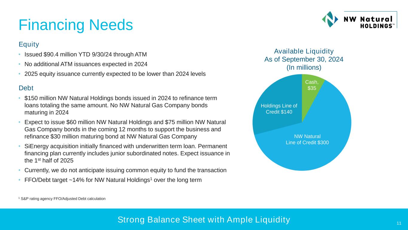 LIQUIDITY OF AND FINANCING Transaction and Financing Details 10 • Acquiring 100% of SiEnergy Operating, LLC and its subsidiaries in sale of membership interests from SiEnergy Capital Partners, LLC • At closing, subject to customary closing adjustments: — Estimated cash payment of $273 million — Debt assumed at closing of $152 million • Underwritten term loan commitment in place for interim financing with a permanent financing plan intended to maintain a strong balance sheet and solid investment grade credit rating. Expect to execute permanent financing in the first half of 2025. Currently, we do not anticipate issuing common equity to fund the transaction • Closing expected in Q1 2025, subject to customary closing conditions including expiration of the waiting period under the Hart-Scott-Rodino Antitrust Improvements Act of 1976, as amended. No regulatory approval is needed from the Railroad Commission of Texas to close this transaction • J.P. Morgan Securities LLC serving as exclusive financial advisor and engaged to act as lead on permanent financing