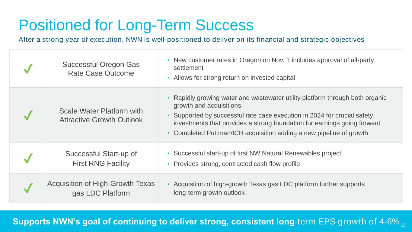 1 S&P rating agency FFO/Adjusted Debt calculation Strong Balance Sheet with Ample Liquidity Financing Needs Equity • Issued $90.4 million YTD 9/30/24 through ATM • No additional ATM issuances expected in 2024 • 2025 equity issuance currently expected to be lower than 2024 levels Debt • $150 million NW Natural Holdings bonds issued in 2024 to refinance term loans totaling the same amount. No NW Natural Gas Company bonds maturing in 2024 • Expect to issue $60 million NW Natural Holdings and $75 million NW Natural Gas Company bonds in the coming 12 months to support the business and refinance $30 million maturing bond at NW Natural Gas Company • SiEnergy acquisition initially financed with underwritten term loan. Permanent financing plan currently includes junior subordinated notes. Expect issuance in the 1st half of 2025 • Currently, we do not anticipate issuing common equity to fund the transaction • FFO/Debt target ~14% for NW Natural Holdings1 over the long term Available Liquidity As of September 30, 2024 (In millions) 11 Cash, $35 NW Natural Line of Credit $300 Holdings Line of Credit $140