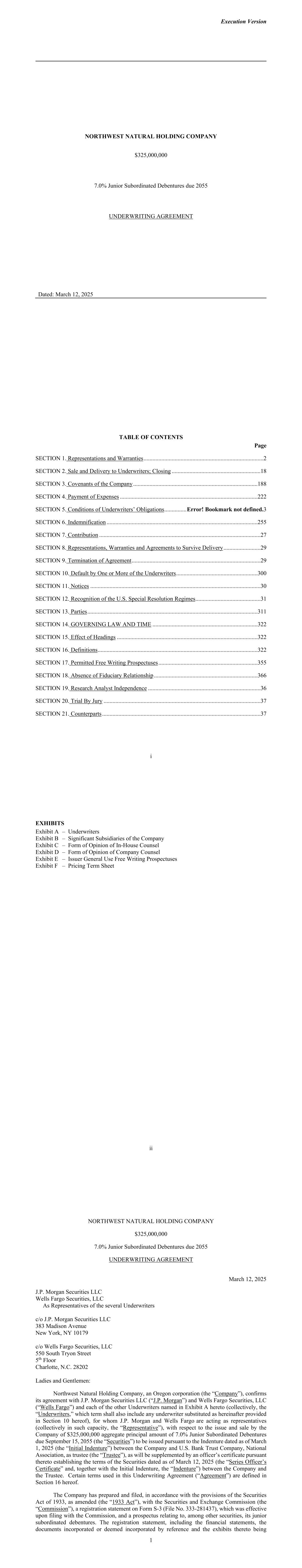 Execution Version NORTHWEST NATURAL HOLDING COMPANY $325,000,000 7.0% Junior Subordinated Debentures due 2055 UNDERWRITING AGREEMENT Dated: March 12, 2025 i TABLE OF CONTENTS Page SECTION 1. Representations and Warranties .................................................................................2 SECTION 2. Sale and Delivery to Underwriters; Closing ............................................................18 SECTION 3. Covenants of the Company ....................................................................................188 SECTION 4. Payment of Expenses .............................................................................................222 SECTION 5. Conditions of Underwriters’ Obligations ............... Error! Bookmark not defined.3 SECTION 6. Indemnification ......................................................................................................255 SECTION 7. Contribution .............................................................................................................27 SECTION 8. Representations, Warranties and Agreements to Survive Delivery .........................29 SECTION 9. Termination of Agreement .......................................................................................29 SECTION 10. Default by One or More of the Underwriters .......................................................300 SECTION 11. Notices ...................................................................................................................30 SECTION 12. Recognition of the U.S. Special Resolution Regimes ............................................31 SECTION 13. Parties ...................................................................................................................311 SECTION 14. GOVERNING LAW AND TIME .......................................................................322 SECTION 15. Effect of Headings ...............................................................................................322 SECTION 16. Definitions ............................................................................................................322 SECTION 17. Permitted Free Writing Prospectuses ...................................................................355 SECTION 18. Absence of Fiduciary Relationship ......................................................................366 SECTION 19. Research Analyst Independence ............................................................................36 SECTION 20. Trial By Jury ..........................................................................................................37 SECTION 21. Counterparts ...........................................................................................................37 ii EXHIBITS Exhibit A – Underwriters Exhibit B – Significant Subsidiaries of the Company Exhibit C – Form of Opinion of In-House Counsel Exhibit D – Form of Opinion of Company Counsel Exhibit E – Issuer General Use Free Writing Prospectuses Exhibit F – Pricing Term Sheet 1 NORTHWEST NATURAL HOLDING COMPANY $325,000,000 7.0% Junior Subordinated Debentures due 2055 UNDERWRITING AGREEMENT March 12, 2025 J.P. Morgan Securities LLC Wells Fargo Securities, LLC As Representatives of the several Underwriters c/o J.P. Morgan Securities LLC 383 Madison Avenue New York, NY 10179 c/o Wells Fargo Securities, LLC 550 South Tryon Street 5th Floor Charlotte, N.C. 28202 Ladies and Gentlemen: Northwest Natural Holding Company, an Oregon corporation (the “Company”), confirms its agreement with J.P. Morgan Securities LLC (“J.P. Morgan”) and Wells Fargo Securities, LLC (“Wells Fargo”) and each of the other Underwriters named in Exhibit A hereto (collectively, the “Underwriters,” which term shall also include any underwriter substituted as hereinafter provided in Section 10 hereof), for whom J.P. Morgan and Wells Fargo are acting as representatives (collectively in such capacity, the “Representative”), with respect to the issue and sale by the Company of $325,000,000 aggregate principal amount of 7.0% Junior Subordinated Debentures due September 15, 2055 (the “Securities”) to be issued pursuant to the Indenture dated as of March 1, 2025 (the “Initial Indenture”) between the Company and U.S. Bank Trust Company, National Association, as trustee (the “Trustee”), as will be supplemented by an officer’s certificate pursuant thereto establishing the terms of the Securities dated as of March 12, 2025 (the “Series Officer’s Certificate” and, together with the Initial Indenture, the “Indenture”) between the Company and the Trustee. Certain terms used in this Underwriting Agreement (“Agreement”) are defined in Section 16 hereof. The Company has prepared and filed, in accordance with the provisions of the Securities Act of 1933, as amended (the “1933 Act”), with the Securities and Exchange Commission (the “Commission”), a registration statement on Form S-3 (File No. 333-281437), which was effective upon filing with the Commission, and a prospectus relating to, among other securities, its junior subordinated debentures. The registration statement, including the financial statements, the documents incorporated or deemed incorporated by reference and the exhibits thereto being