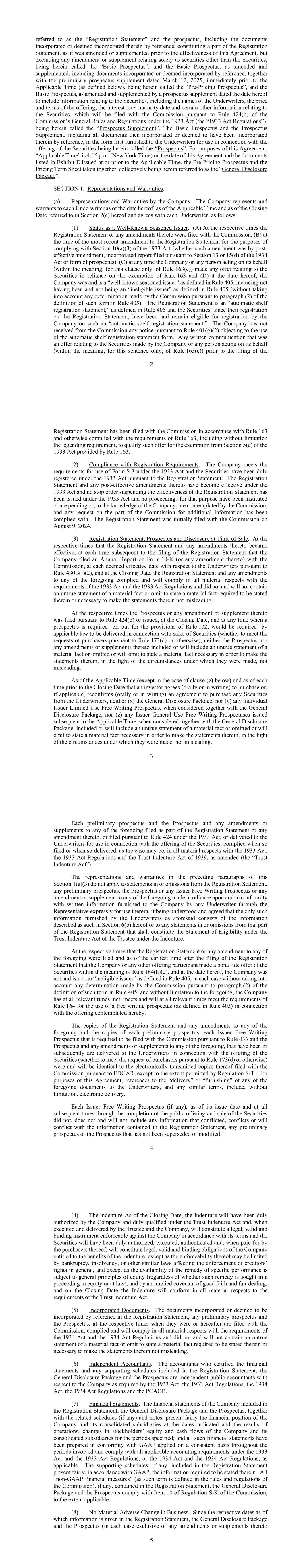 2 referred to as the “Registration Statement” and the prospectus, including the documents incorporated or deemed incorporated therein by reference, constituting a part of the Registration Statement, as it was amended or supplemented prior to the effectiveness of this Agreement, but excluding any amendment or supplement relating solely to securities other than the Securities, being herein called the “Basic Prospectus”, and the Basic Prospectus, as amended and supplemented, including documents incorporated or deemed incorporated by reference, together with the preliminary prospectus supplement dated March 12, 2025, immediately prior to the Applicable Time (as defined below), being herein called the “Pre-Pricing Prospectus”, and the Basic Prospectus, as amended and supplemented by a prospectus supplement dated the date hereof to include information relating to the Securities, including the names of the Underwriters, the price and terms of the offering, the interest rate, maturity date and certain other information relating to the Securities, which will be filed with the Commission pursuant to Rule 424(b) of the Commission’s General Rules and Regulations under the 1933 Act (the “1933 Act Regulations”), being herein called the “Prospectus Supplement”. The Basic Prospectus and the Prospectus Supplement, including all documents then incorporated or deemed to have been incorporated therein by reference, in the form first furnished to the Underwriters for use in connection with the offering of the Securities being herein called the “Prospectus”. For purposes of this Agreement, “Applicable Time” is 4:15 p.m. (New York Time) on the date of this Agreement and the documents listed in Exhibit E issued at or prior to the Applicable Time, the Pre-Pricing Prospectus and the Pricing Term Sheet taken together, collectively being herein referred to as the “General Disclosure Package”. SECTION 1. Representations and Warranties. (a) Representations and Warranties by the Company. The Company represents and warrants to each Underwriter as of the date hereof, as of the Applicable Time and as of the Closing Date referred to in Section 2(c) hereof and agrees with each Underwriter, as follows: (1) Status as a Well-Known Seasoned Issuer. (A) At the respective times the Registration Statement or any amendments thereto were filed with the Commission, (B) at the time of the most recent amendment to the Registration Statement for the purposes of complying with Section 10(a)(3) of the 1933 Act (whether such amendment was by post- effective amendment, incorporated report filed pursuant to Section 13 or 15(d) of the 1934 Act or form of prospectus), (C) at any time the Company or any person acting on its behalf (within the meaning, for this clause only, of Rule 163(c)) made any offer relating to the Securities in reliance on the exemption of Rule 163 and (D) at the date hereof, the Company was and is a “well-known seasoned issuer” as defined in Rule 405, including not having been and not being an “ineligible issuer” as defined in Rule 405 (without taking into account any determination made by the Commission pursuant to paragraph (2) of the definition of such term in Rule 405). The Registration Statement is an “automatic shelf registration statement,” as defined in Rule 405 and the Securities, since their registration on the Registration Statement, have been and remain eligible for registration by the Company on such an “automatic shelf registration statement.” The Company has not received from the Commission any notice pursuant to Rule 401(g)(2) objecting to the use of the automatic shelf registration statement form. Any written communication that was an offer relating to the Securities made by the Company or any person acting on its behalf (within the meaning, for this sentence only, of Rule 163(c)) prior to the filing of the 3 Registration Statement has been filed with the Commission in accordance with Rule 163 and otherwise complied with the requirements of Rule 163, including without limitation the legending requirement, to qualify such offer for the exemption from Section 5(c) of the 1933 Act provided by Rule 163. (2) Compliance with Registration Requirements. The Company meets the requirements for use of Form S-3 under the 1933 Act and the Securities have been duly registered under the 1933 Act pursuant to the Registration Statement. The Registration Statement and any post-effective amendments thereto have become effective under the 1933 Act and no stop order suspending the effectiveness of the Registration Statement has been issued under the 1933 Act and no proceedings for that purpose have been instituted or are pending or, to the knowledge of the Company, are contemplated by the Commission, and any request on the part of the Commission for additional information has been complied with. The Registration Statement was initially filed with the Commission on August 9, 2024. (3) Registration Statement, Prospectus and Disclosure at Time of Sale. At the respective times that the Registration Statement and any amendments thereto became effective, at each time subsequent to the filing of the Registration Statement that the Company filed an Annual Report on Form 10-K (or any amendment thereto) with the Commission, at each deemed effective date with respect to the Underwriters pursuant to Rule 430B(f)(2), and at the Closing Date, the Registration Statement and any amendments to any of the foregoing complied and will comply in all material respects with the requirements of the 1933 Act and the 1933 Act Regulations and did not and will not contain an untrue statement of a material fact or omit to state a material fact required to be stated therein or necessary to make the statements therein not misleading. At the respective times the Prospectus or any amendment or supplement thereto was filed pursuant to Rule 424(b) or issued, at the Closing Date, and at any time when a prospect