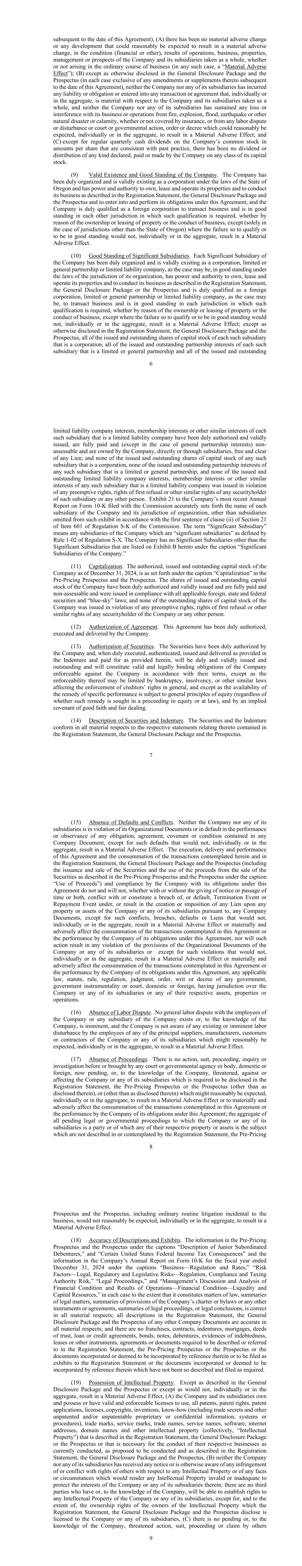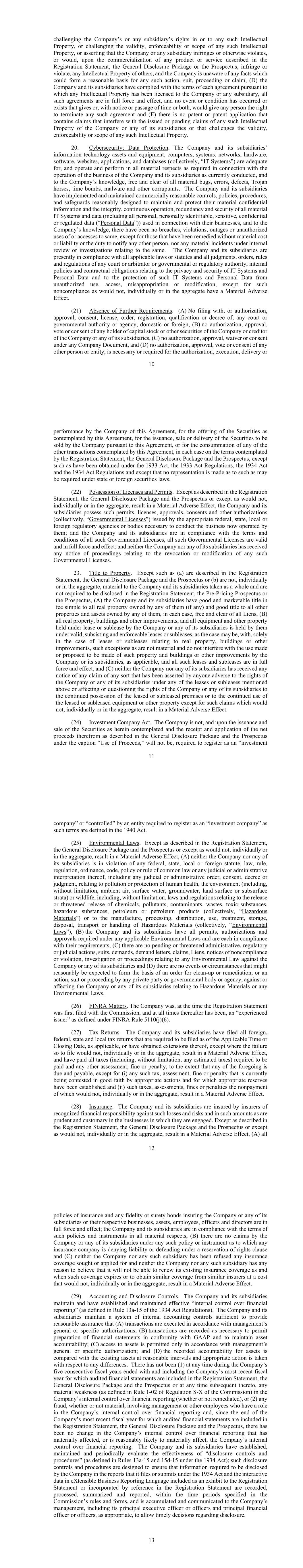 10 challenging the Company’s or any subsidiary’s rights in or to any such Intellectual Property, or challenging the validity, enforceability or scope of any such Intellectual Property, or asserting that the Company or any subsidiary infringes or otherwise violates, or would, upon the commercialization of any product or service described in the Registration Statement, the General Disclosure Package or the Prospectus, infringe or violate, any Intellectual Property of others, and the Company is unaware of any facts which could form a reasonable basis for any such action, suit, proceeding or claim, (D) the Company and its subsidiaries have complied with the terms of each agreement pursuant to which any Intellectual Property has been licensed to the Company or any subsidiary, all such agreements are in full force and effect, and no event or condition has occurred or exists that gives or, with notice or passage of time or both, would give any person the right to terminate any such agreement and (E) there is no patent or patent application that contains claims that interfere with the issued or pending claims of any such Intellectual Property of the Company or any of its subsidiaries or that challenges the validity, enforceability or scope of any such Intellectual Property. 20. Cybersecurity; Data Protection. The Company and its subsidiaries’ information technology assets and equipment, computers, systems, networks, hardware, software, websites, applications, and databases (collectively, “IT Systems”) are adequate for, and operate and perform in all material respects as required in connection with the operation of the business of the Company and its subsidiaries as currently conducted, and to the Company’s knowledge, free and clear of all material bugs, errors, defects, Trojan horses, time bombs, malware and other corruptants. The Company and its subsidiaries have implemented and maintained commercially reasonable controls, policies, procedures, and safeguards reasonably designed to maintain and protect their material confidential information and the integrity, continuous operation, redundancy and security of all material IT Systems and data (including all personal, personally identifiable, sensitive, confidential or regulated data (“Personal Data”)) used in connection with their businesses, and to the Company’s knowledge, there have been no breaches, violations, outages or unauthorized uses of or accesses to same, except for those that have been remedied without material cost or liability or the duty to notify any other person, nor any material incidents under internal review or investigations relating to the same. The Company and its subsidiaries are presently in compliance with all applicable laws or statutes and all judgments, orders, rules and regulations of any court or arbitrator or governmental or regulatory authority, internal policies and contractual obligations relating to the privacy and security of IT Systems and Personal Data and to the protection of such IT Systems and Personal Data from unauthorized use, access, misappropriation or modification, except for such noncompliance as would not, individually or in the aggregate have a Material Adverse Effect. (21) Absence of Further Requirements. (A) No filing with, or authorization, approval, consent, license, order, registration, qualification or decree of, any court or governmental authority or agency, domestic or foreign, (B) no authorization, approval, vote or consent of any holder of capital stock or other securities of the Company or creditor of the Company or any of its subsidiaries, (C) no authorization, approval, waiver or consent under any Company Document, and (D) no authorization, approval, vote or consent of any other person or entity, is necessary or required for the authorization, execution, delivery or 11 performance by the Company of this Agreement, for the offering of the Securities as contemplated by this Agreement, for the issuance, sale or delivery of the Securities to be sold by the Company pursuant to this Agreement, or for the consummation of any of the other transactions contemplated by this Agreement, in each case on the terms contemplated by the Registration Statement, the General Disclosure Package and the Prospectus, except such as have been obtained under the 1933 Act, the 1933 Act Regulations, the 1934 Act and the 1934 Act Regulations and except that no representation is made as to such as may be required under state or foreign securities laws. (22) Possession of Licenses and Permits. Except as described in the Registration Statement, the General Disclosure Package and the Prospectus or except as would not, individually or in the aggregate, result in a Material Adverse Effect, the Company and its subsidiaries possess such permits, licenses, approvals, consents and other authorizations (collectively, “Governmental Licenses”) issued by the appropriate federal, state, local or foreign regulatory agencies or bodies necessary to conduct the business now operated by them; and the Company and its subsidiaries are in compliance with the terms and conditions of all such Governmental Licenses, all such Governmental Licenses are valid and in full force and effect; and neither the Company nor any of its subsidiaries has received any notice of proceedings relating to the revocation or modification of any such Governmental Licenses. 23. Title to Property. Except such as (a) are described in the Registration Statement, the General Disclosure Package and the Prospectus or (b) are not, individually or in the aggregate, material to the Company and its subsidiaries taken as a whole and are not required to be disclosed in the Registration Statement, the Pre-Pricing Prospectus or the Prospectus, (A) the Company and its subsidiaries have good and marketable title in fee simple to all real property owned by any of them (if any) and good title to all other properties and assets owned by any of them, in each