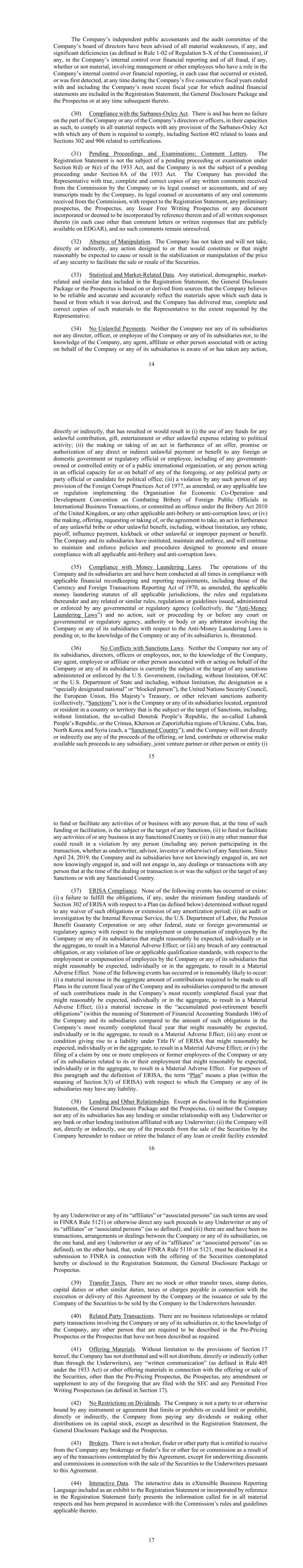 14 The Company’s independent public accountants and the audit committee of the Company’s board of directors have been advised of all material weaknesses, if any, and significant deficiencies (as defined in Rule 1-02 of Regulation S-X of the Commission), if any, in the Company’s internal control over financial reporting and of all fraud, if any, whether or not material, involving management or other employees who have a role in the Company’s internal control over financial reporting, in each case that occurred or existed, or was first detected, at any time during the Company’s five consecutive fiscal years ended with and including the Company’s most recent fiscal year for which audited financial statements are included in the Registration Statement, the General Disclosure Package and the Prospectus or at any time subsequent thereto. (30) Compliance with the Sarbanes-Oxley Act. There is and has been no failure on the part of the Company or any of the Company’s directors or officers, in their capacities as such, to comply in all material respects with any provision of the Sarbanes-Oxley Act with which any of them is required to comply, including Section 402 related to loans and Sections 302 and 906 related to certifications. (31) Pending Proceedings and Examinations; Comment Letters. The Registration Statement is not the subject of a pending proceeding or examination under Section 8(d) or 8(e) of the 1933 Act, and the Company is not the subject of a pending proceeding under Section 8A of the 1933 Act. The Company has provided the Representative with true, complete and correct copies of any written comments received from the Commission by the Company or its legal counsel or accountants, and of any transcripts made by the Company, its legal counsel or accountants of any oral comments received from the Commission, with respect to the Registration Statement, any preliminary prospectus, the Prospectus, any Issuer Free Writing Prospectus or any document incorporated or deemed to be incorporated by reference therein and of all written responses thereto (in each case other than comment letters or written responses that are publicly available on EDGAR), and no such comments remain unresolved. (32) Absence of Manipulation. The Company has not taken and will not take, directly or indirectly, any action designed to or that would constitute or that might reasonably be expected to cause or result in the stabilization or manipulation of the price of any security to facilitate the sale or resale of the Securities. (33) Statistical and Market-Related Data. Any statistical, demographic, market- related and similar data included in the Registration Statement, the General Disclosure Package or the Prospectus is based on or derived from sources that the Company believes to be reliable and accurate and accurately reflect the materials upon which such data is based or from which it was derived, and the Company has delivered true, complete and correct copies of such materials to the Representative to the extent requested by the Representative. (34) No Unlawful Payments. Neither the Company nor any of its subsidiaries nor any director, officer, or employee of the Company or any of its subsidiaries nor, to the knowledge of the Company, any agent, affiliate or other person associated with or acting on behalf of the Company or any of its subsidiaries is aware of or has taken any action, 15 directly or indirectly, that has resulted or would result in (i) the use of any funds for any unlawful contribution, gift, entertainment or other unlawful expense relating to political activity; (ii) the making or taking of an act in furtherance of an offer, promise or authorization of any direct or indirect unlawful payment or benefit to any foreign or domestic government or regulatory official or employee, including of any government- owned or controlled entity or of a public international organization, or any person acting in an official capacity for or on behalf of any of the foregoing, or any political party or party official or candidate for political office; (iii) a violation by any such person of any provision of the Foreign Corrupt Practices Act of 1977, as amended, or any applicable law or regulation implementing the Organisation for Economic Co-Operation and Development Convention on Combating Bribery of Foreign Public Officials in International Business Transactions, or committed an offence under the Bribery Act 2010 of the United Kingdom, or any other applicable anti-bribery or anti-corruption laws; or (iv) the making, offering, requesting or taking of, or the agreement to take, an act in furtherance of any unlawful bribe or other unlawful benefit, including, without limitation, any rebate, payoff, influence payment, kickback or other unlawful or improper payment or benefit. The Company and its subsidiaries have instituted, maintain and enforce, and will continue to maintain and enforce policies and procedures designed to promote and ensure compliance with all applicable anti-bribery and anti-corruption laws. (35) Compliance with Money Laundering Laws. The operations of the Company and its subsidiaries are and have been conducted at all times in compliance with applicable financial recordkeeping and reporting requirements, including those of the Currency and Foreign Transactions Reporting Act of 1970, as amended, the applicable money laundering statutes of all applicable jurisdictions, the rules and regulations thereunder and any related or similar rules, regulations or guidelines issued, administered or enforced by any governmental or regulatory agency (collectively, the “Anti-Money Laundering Laws”) and no action, suit or proceeding by or before any court or governmental or regulatory agency, authority or body or any arbitrator involving the Company or any of its subsidiaries with respect to the Anti-Money Laundering Laws is pending or, to the knowledge of the Company or any of its subsidiaries is, t